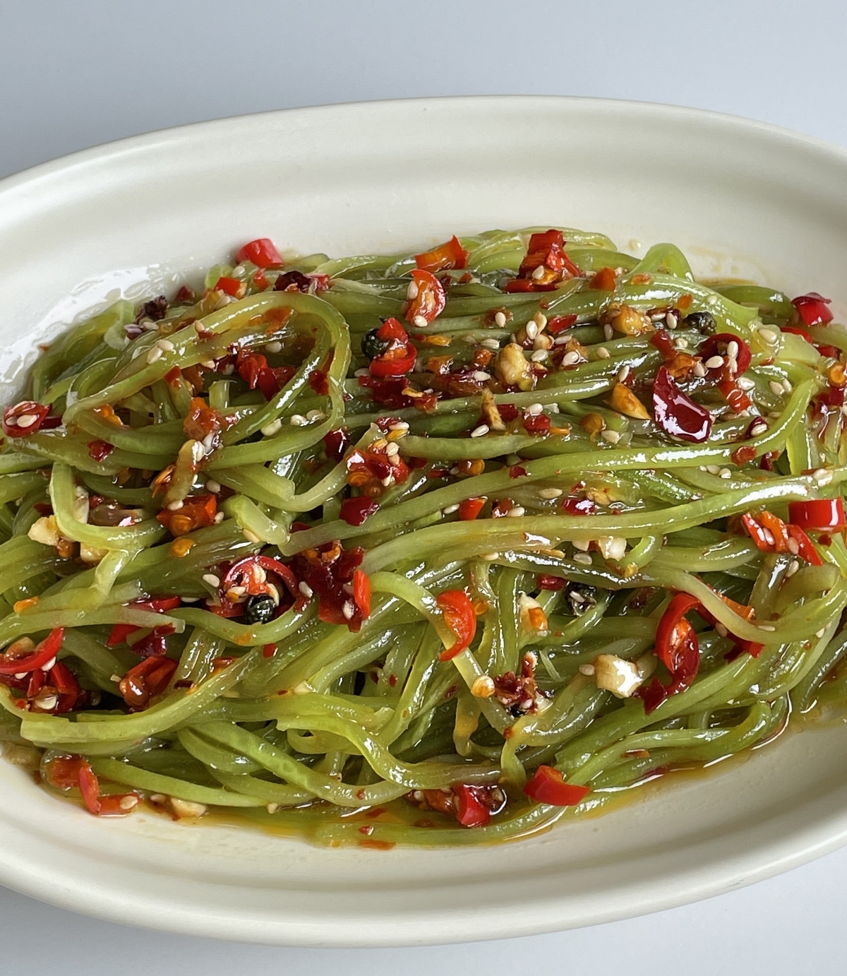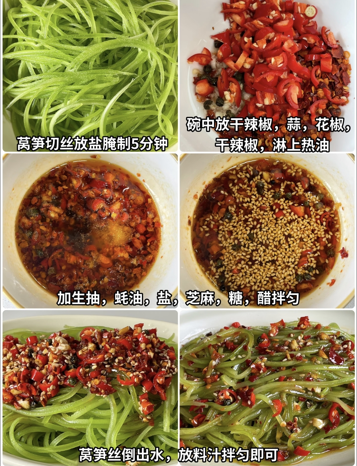 最后,带上一次性手套,抓拌均匀。你会发现,经过腌制的莴笋丝,像海绵一样吸饱了料汁的香味,但又不会变得软烂。夹起一筷子放进嘴里,第一感觉是脆,咬下去是嫩,紧接着是酸、辣、咸、甜在舌尖交织,清爽解腻,回味还带着一丝莴笋特有的清香。