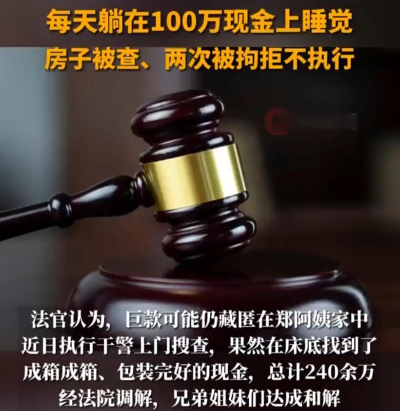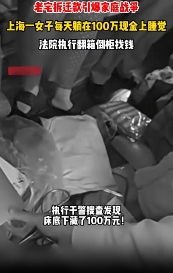 当上海虹口法院执行干警持搜查令进入郑阿姨家时,他们发现了令人震惊的一幕:床铺褥子底下整齐码放着100万元现金,意味着郑阿姨每晚都躺在这笔钱上入眠。