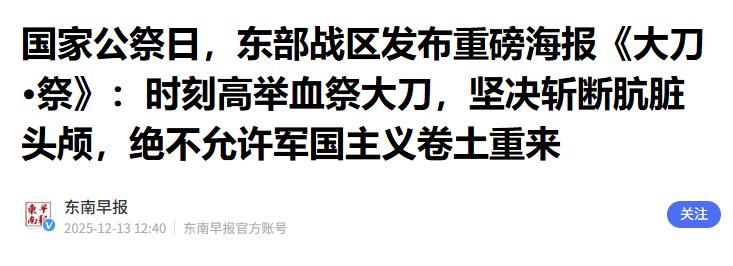 东南早报 2025-12-13——国家公祭日,东部战区发布重磅海报《大刀·祭》:时刻高举血祭大刀,坚决斩断肮脏头颅,绝不允许军国主义卷土重来