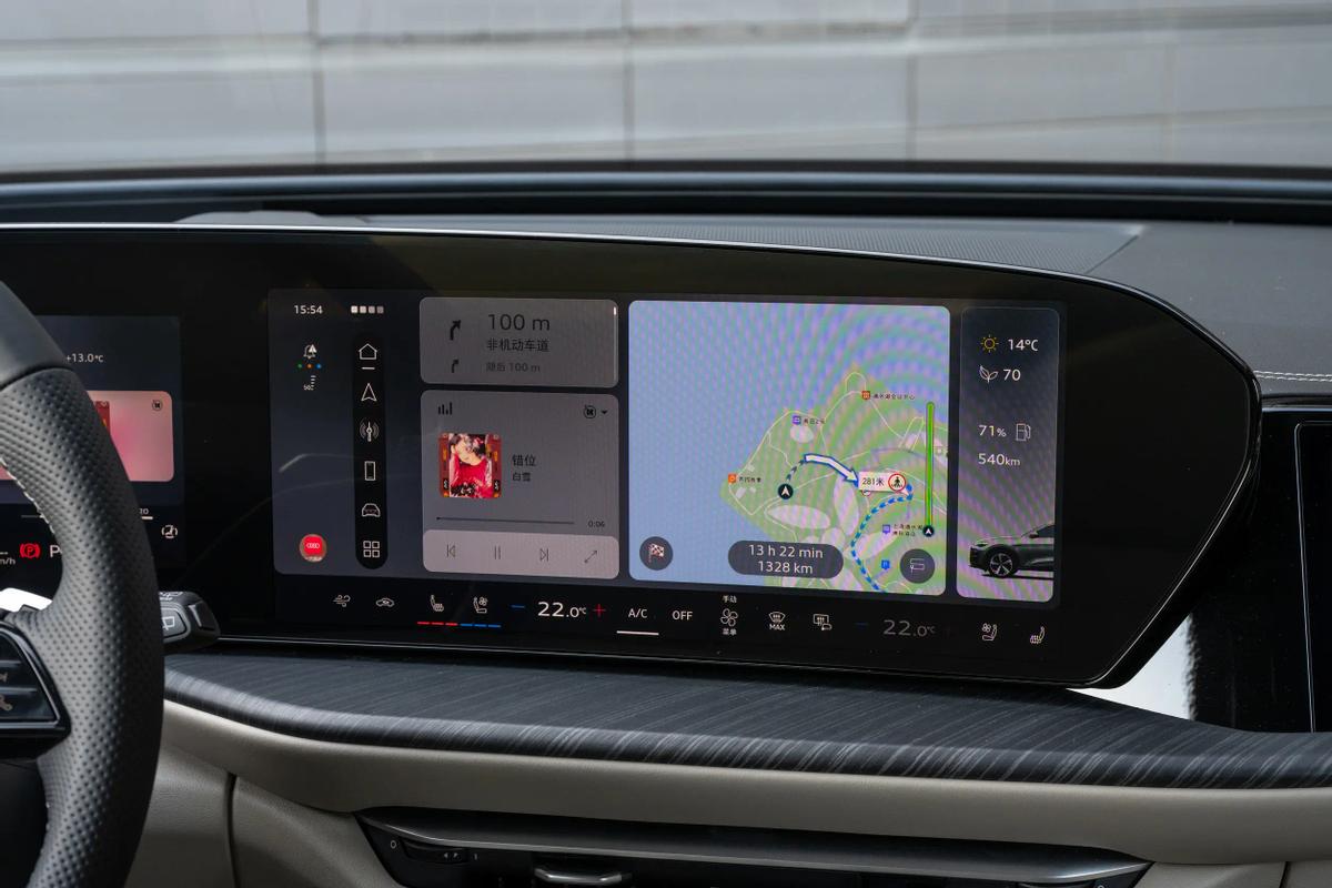 全新Q5L的智能座舱可以说的三联屏,并与HUD组成四屏联动,其中,11.9+14.5英寸OLED曲面屏还是偏向于主驾一侧,这依旧是奥迪的标志性设计。不过,车辆虽然更新了全新的智能车机系统,但卡片式的UI设计、传统的语音交互方式等等,都让其在智能体验上略逊色一些。