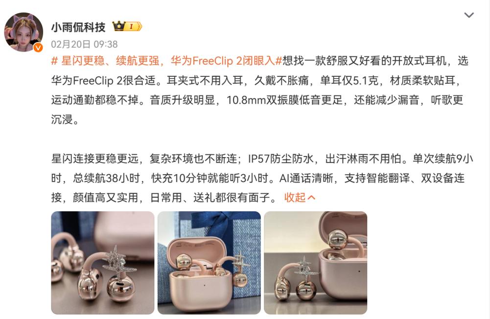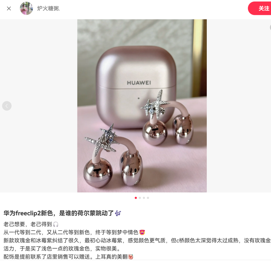 这种断层式的统治力,在真实的互联网社交平台上展现得淋漓尽致。在各大社交平台,关于华为FreeClip 2 耳夹耳机的自发好评可谓铺天盖地,“耳夹式不用入耳,久戴不胀痛”“颜值高又实用”“上耳真的美翻”……