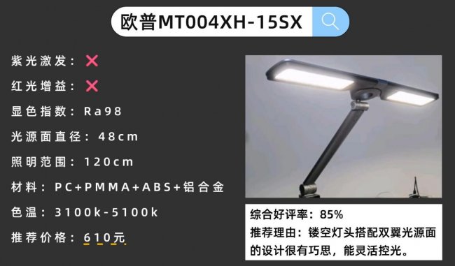 护眼灯品牌排行第一名有哪些牌子?欧普MT004XH-15SX采用48cm双翼灯头搭配侧发光设计,光线可以均匀铺满约160cm桌面,避免亮度集中或刺眼。它的灯头可多角度翻转,配合阻尼转轴,上下左右自由调节光照方向,适应不同坐姿和桌面高度。此外功能方面支持入座感应、智能调光、多档亮度与场景模式切换,并带定时休息提醒,操作便利。缺点是光环境传感器在夜间容易被外界干扰误触,可能突然亮灯。
