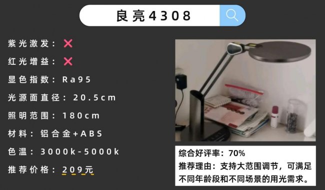 护眼灯品牌排行第一名有哪些牌子?良亮4308是一款主打大照明范围和实用功能的基础型护眼台灯,它的20.5cm直径的圆形光源面,照明范围能达到180cm,即便大尺寸书桌也能覆盖到位。功能配置很贴近日常使用,配备定时休息功能,能提醒合理用眼。操作采用触控方式,面板上设有开关、模式切换等按键。
