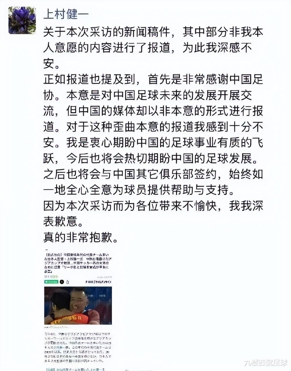 不过,随着这件事情的发酵,已经成为广州英华思力足球俱乐部青训总监和一线队主帅的上村健一在自己的朋友圈进行的致歉。