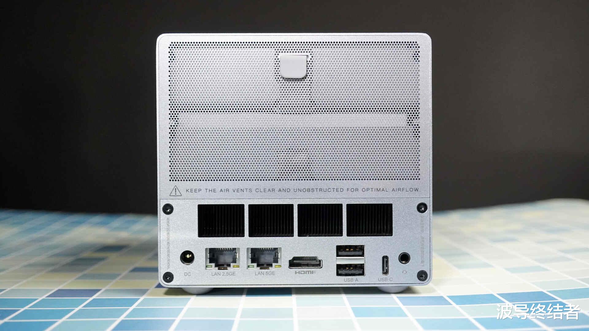 背面是主要的功能接口区,机械硬盘也从这里安装。上面2/3的部分装机械硬盘,取下磁吸的金属防尘罩,拧下螺丝抽出硬盘柜即可。下面是主板,除了散热片和通风口外,还有一个2.5G和一个5G的双网口,支持4K60Hz的HDMI视频输出,2个USB2.0的A口,一个支持视频输出的10Gbps Type-C接口,以及3.5mm音频孔。