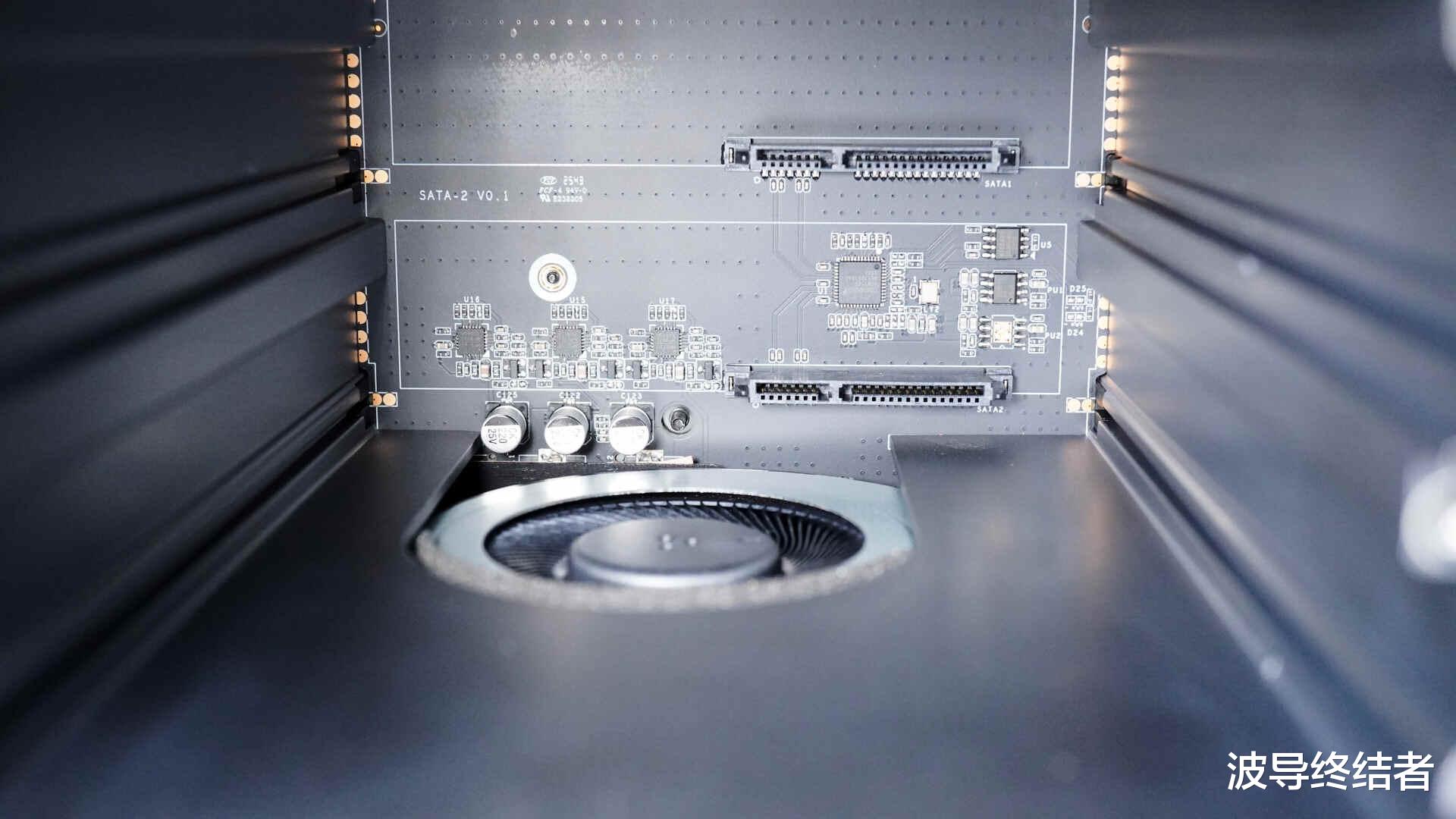鼓风机风扇从底部,以及上部同时抽风,再把热气从后面排出,整体风道形成了冷热交换。上部的冷风抽取流经两个机械硬盘位,下面固态硬盘以及主板工作的热量也由这整个系统带走。