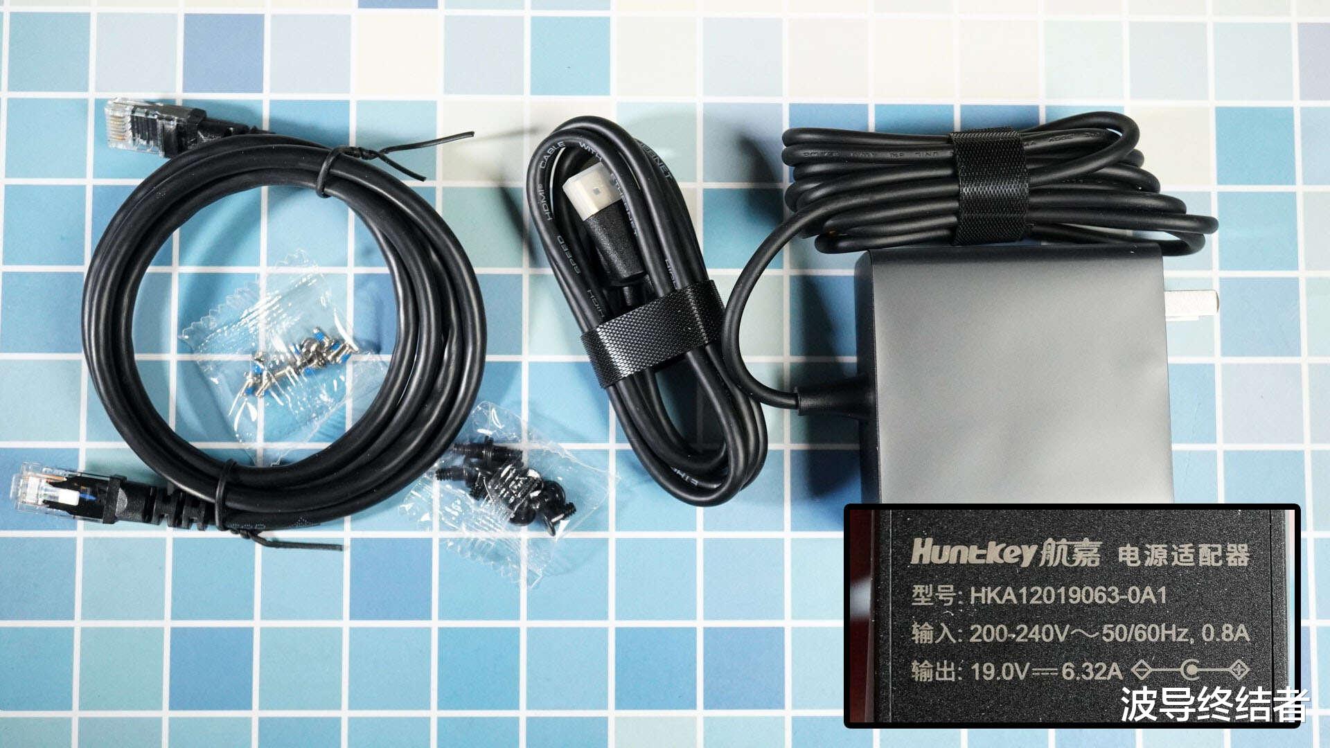 配件方面,给了两包螺丝,黑色带减震硅胶的用于3.5英寸机械硬盘。一条网线,一条HDMI线。电源适配器是航嘉的DC电源,标准19V6.32A,120W的总功率拉啥都够了。