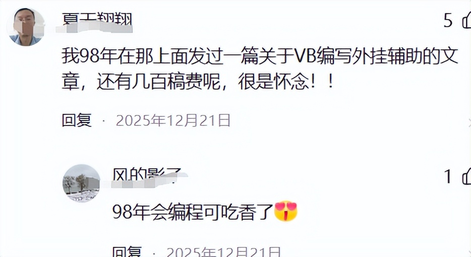 还有人分享:“98 年我在上面发过一篇 VB 写外挂辅助的文章,还有几百块稿费,特别自豪。”