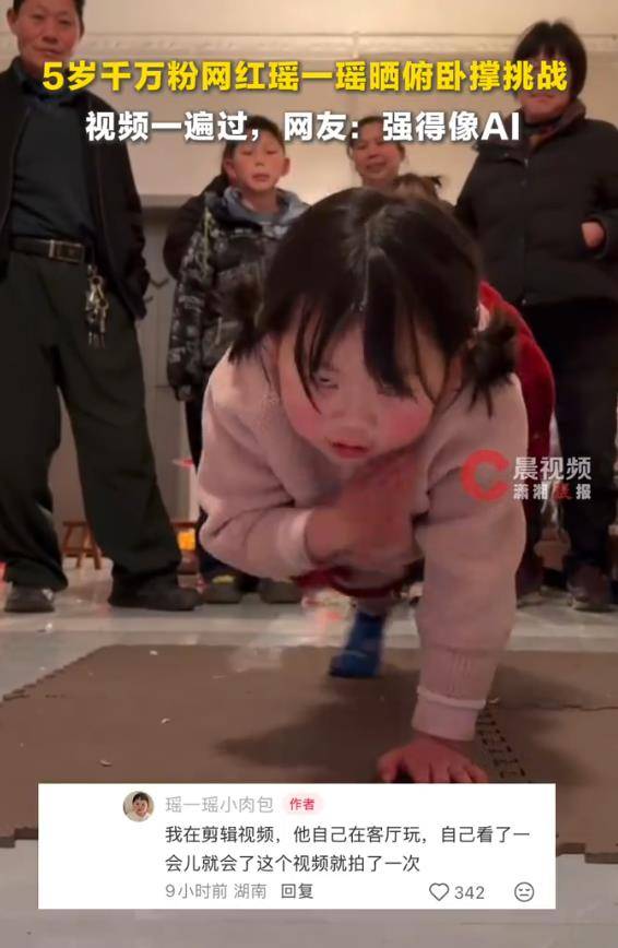 镜头前,瑶一瑶连续完成俯卧撑,其核心稳定与动作连贯性远超同龄人,有网友直言“成年人也难做到”。母亲声称视频“只拍一次即成功”,但质疑声随之而来:五岁孩童需经多少重复练习才能达到如此熟练度?担忧迅速从动作真实性转向对儿童健康的拷问。有网友指出,孩子笑容中“带着讨好”,质疑父母是否已将女儿异化为“赚钱工具”,以牺牲童年快乐与自然成长为代价,追逐流量效应。
