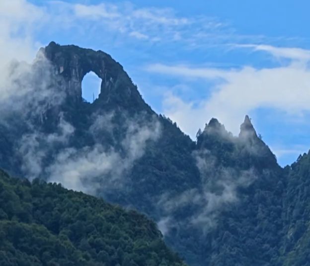 石月亮是一个典型的碳酸盐岩溶蚀穿洞地貌。其形成历经数万年的水流溶蚀与风化剥蚀,岩层中的裂隙在长期外力作用下逐渐扩大,最终贯通山体,形成一个高约30米、宽约40米的椭圆形孔洞。晴朗天气下,从怒江峡谷的特定角度远眺,蓝天或云层从孔洞后方透出,呈现类似夜月悬空的视觉效果。
