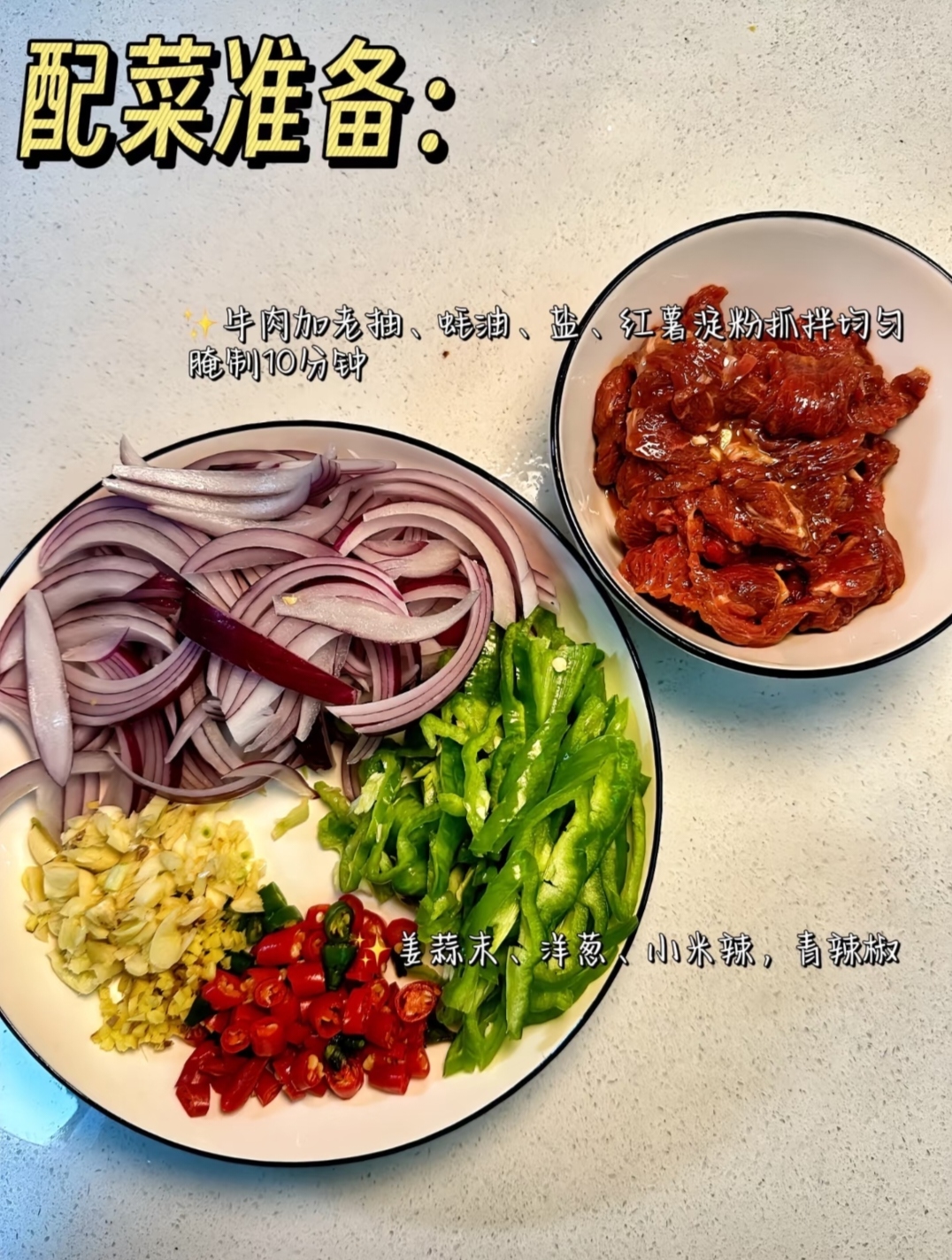抓匀后静置10分钟,让牛肉充分吸收调料。这时候你可以去切洋葱、备辣椒,时间刚刚好。