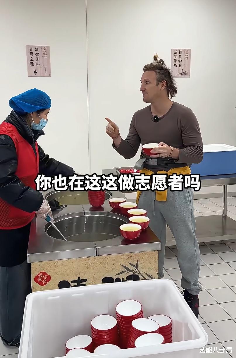 俩老外赶紧排队,各自打了满满一海碗的饭菜,一路跟工作人员打听,发现盛汤的阿姨、洗碗的大叔,全部都是志愿者。