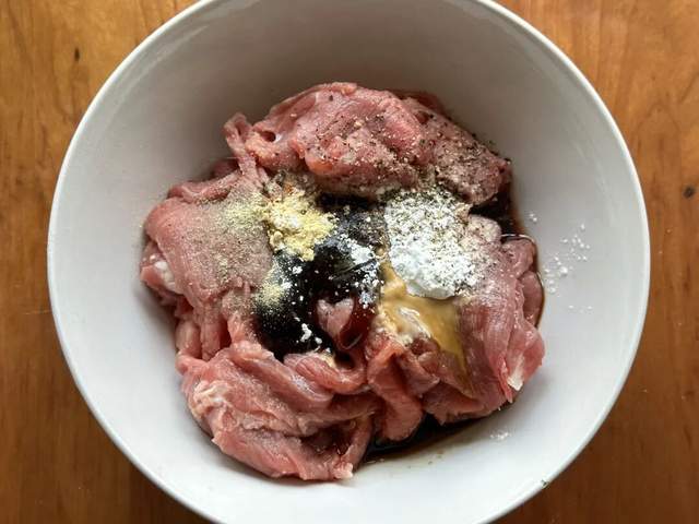 1、牛肉提前切成薄片,加入这些调料:生抽1勺 蚝油1勺 淀粉1勺 白胡椒粉适量 姜粉适量 现磨黑胡椒适量,抓拌均匀;