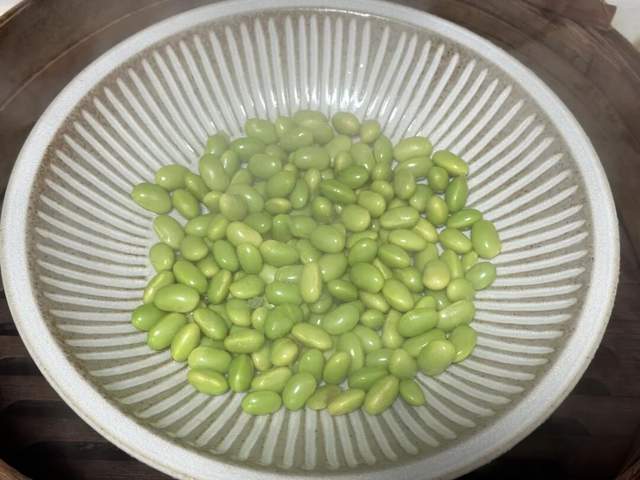 3、准备一些毛豆,可以提前焯水煮一煮,也可以清洗干净放在盘子里提前蒸10分钟;