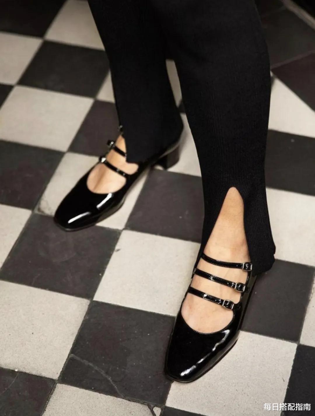 鞋子的材质光泽度也值得关注,微光泽皮革玛丽珍鞋能够在视觉上弱化鞋子与裤子的界限,让造型更加整体。