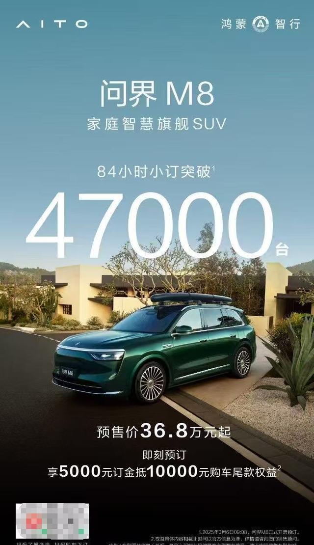 问界M8作为起价36.8万的“家庭智慧旗舰SUV”开始预售之后,小订数量增长得特别快。1小时小订数量是7500台,6小时就到了21000台,36小时是36000台。等到84小时的时候,问界M8的小订数量已经非常惊人了,达到了47000台。