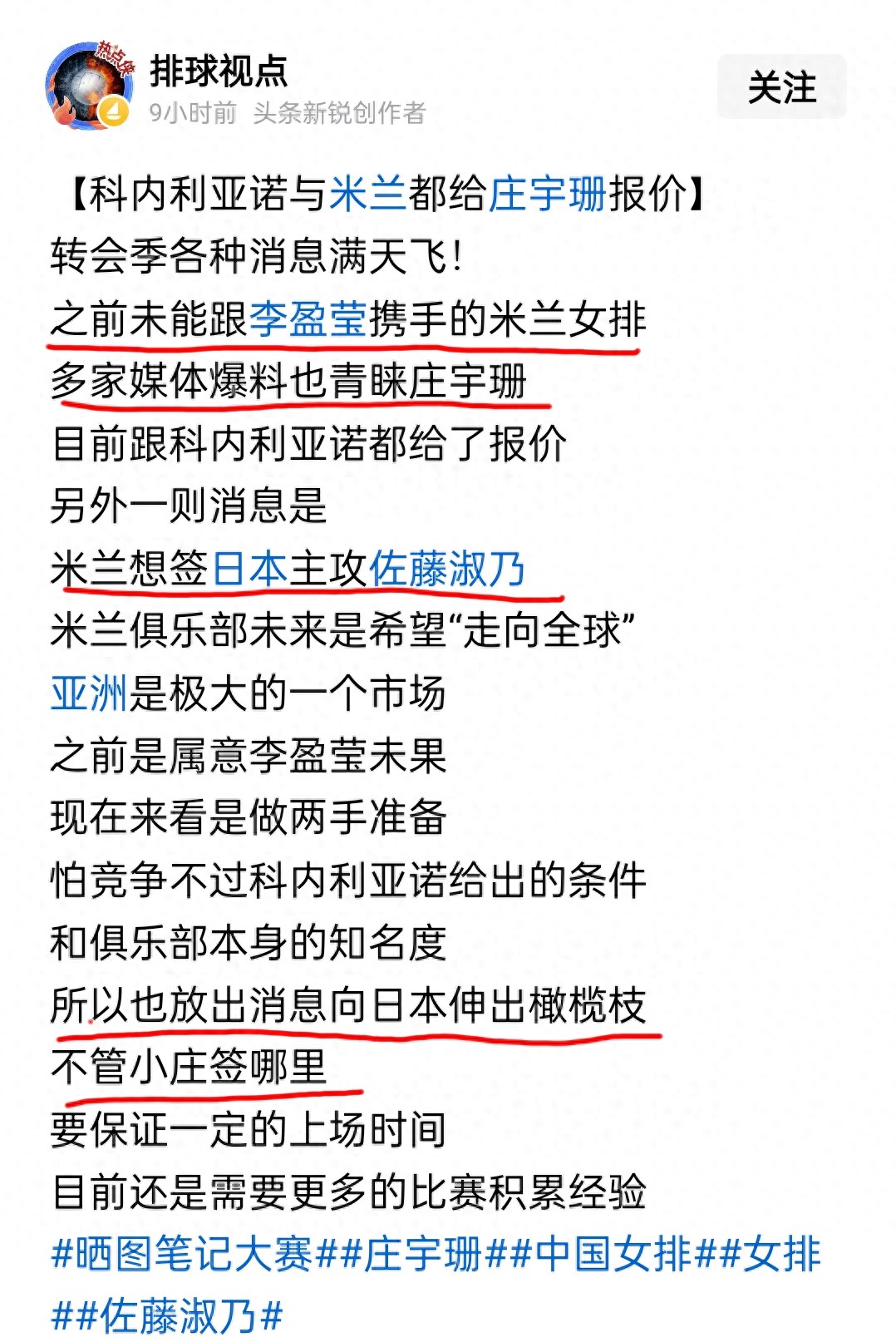 据头条新锐创作者“排球视点”等多位头条自媒体创作者消息,下一赛季米兰队欲签下中国籍主攻庄宇珊和日本籍主攻佐藤淑乃;科内利亚诺也给庄宇珊抛出了橄榄枝,科内利亚诺已经“给庄宇珊报价”了。目前,朱婷的经纪人马可在个人社交媒体平台爆出与庄宇珊合影的照片,是不是意味着马可已经在推动庄宇珊加盟科内利亚诺呢?