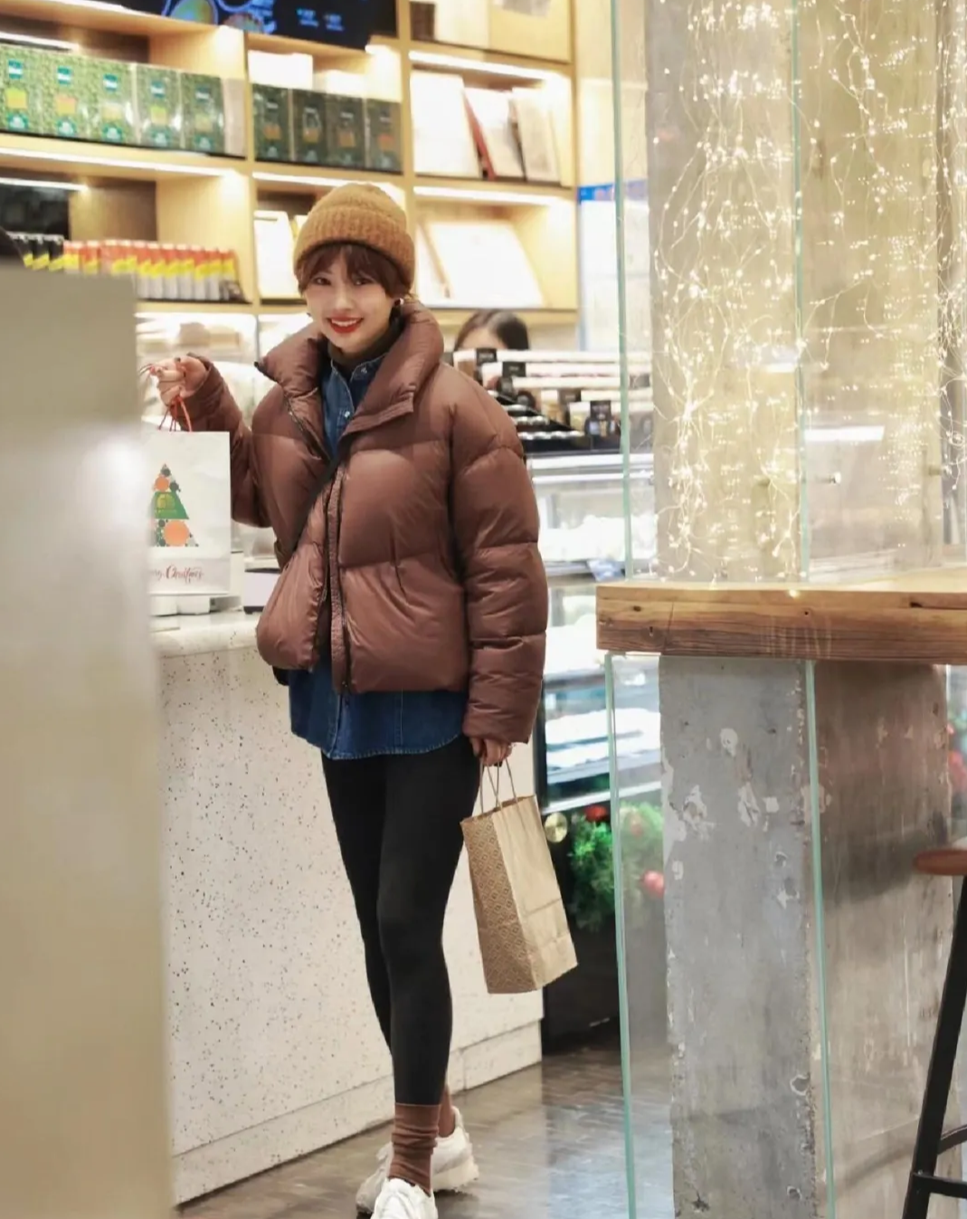 短款羽绒服瑜伽打底裤真的是很难好看,因为大部分会觉得有点尴尬,但稍微加了一件长一点的牛仔衬衣在里面,效果就好很多。