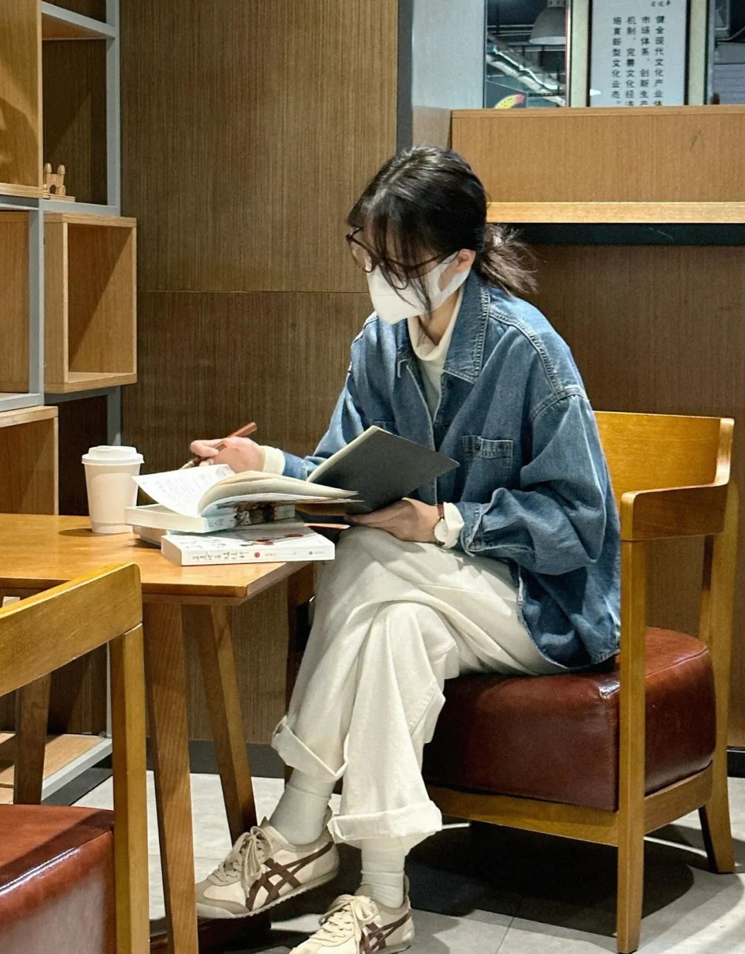 蓝色+棕色这样的配色非常符合秋冬季节,很多人害怕尝试棕色,其实真的不要怕, 棕色没有那么难搭配,如果觉得挑人,可以选择化妆,同样搭配灰色半裙,再搭配一双板鞋,休闲不失气质感。