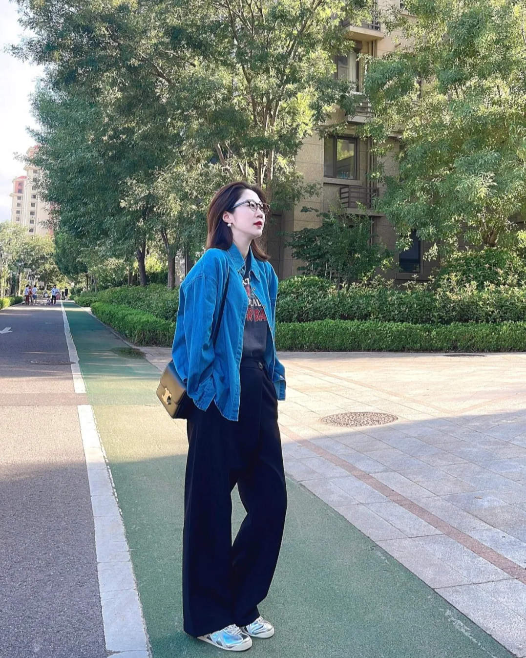 想不到怎么穿的时候,用牛仔衬衣搭配深蓝色牛仔裤,简约又大方。
