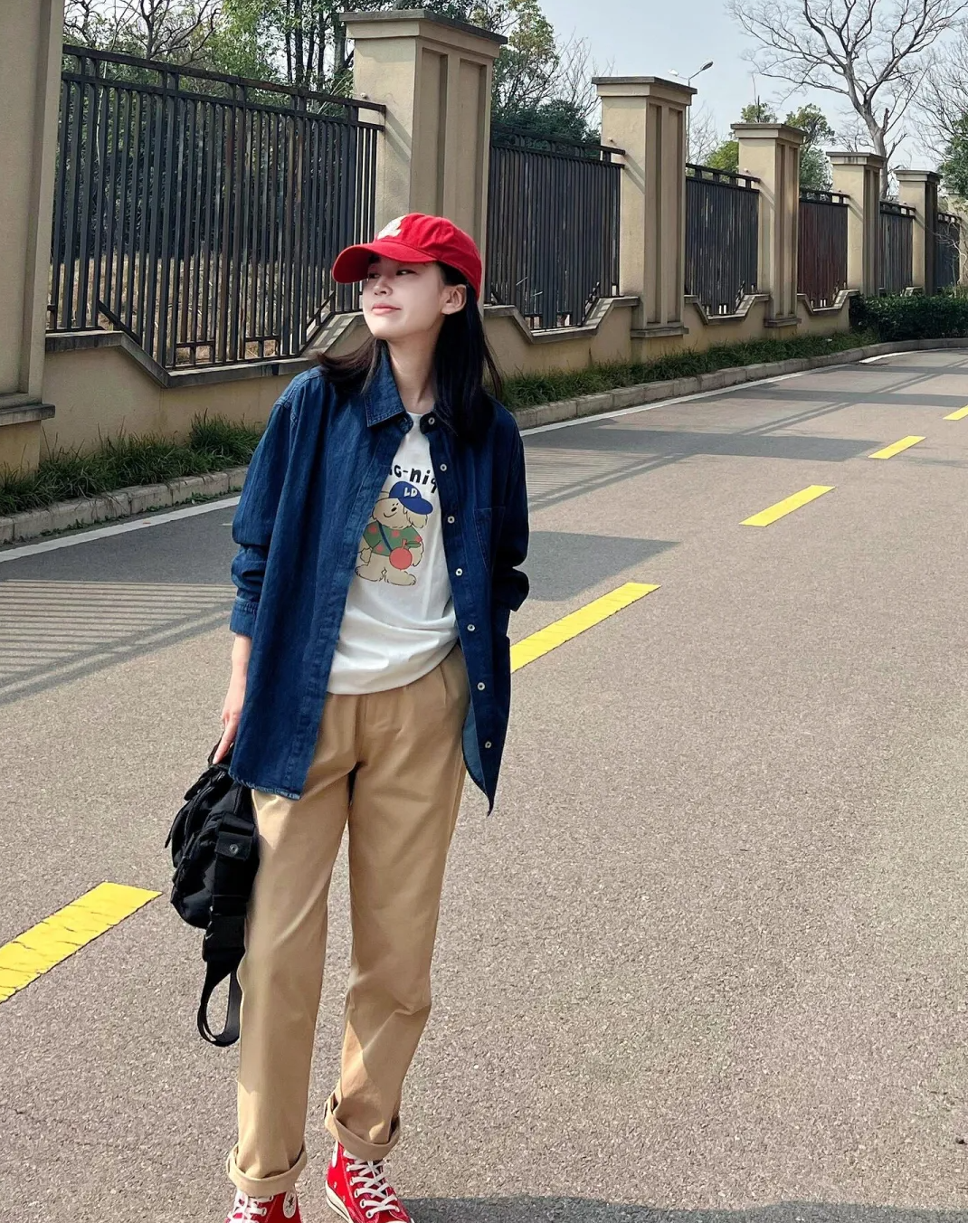 蓝色配红色永远都是yyds,蓝色衬衣搭配白色印花衬衣,下装搭配卡其色长裤,颜色非常清爽耐看,但这样看好像有点普通,不过红色的鞋子和帽子立马让整个造型加分不少。