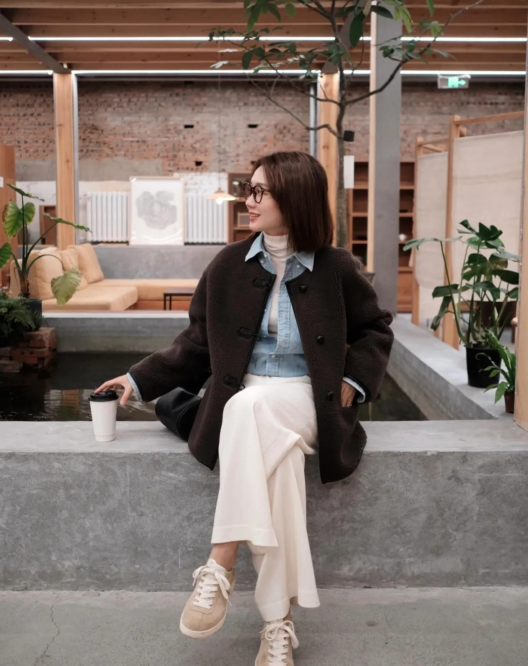 短款的大衣其实比长款大衣更加挑人,但是在选择搭配内搭的时候选择年轻感一点的搭配就不一样了,选择浅色牛仔衬衣配黑色高领打底衫,下装搭配白色阔腿裤,舒适又气质。