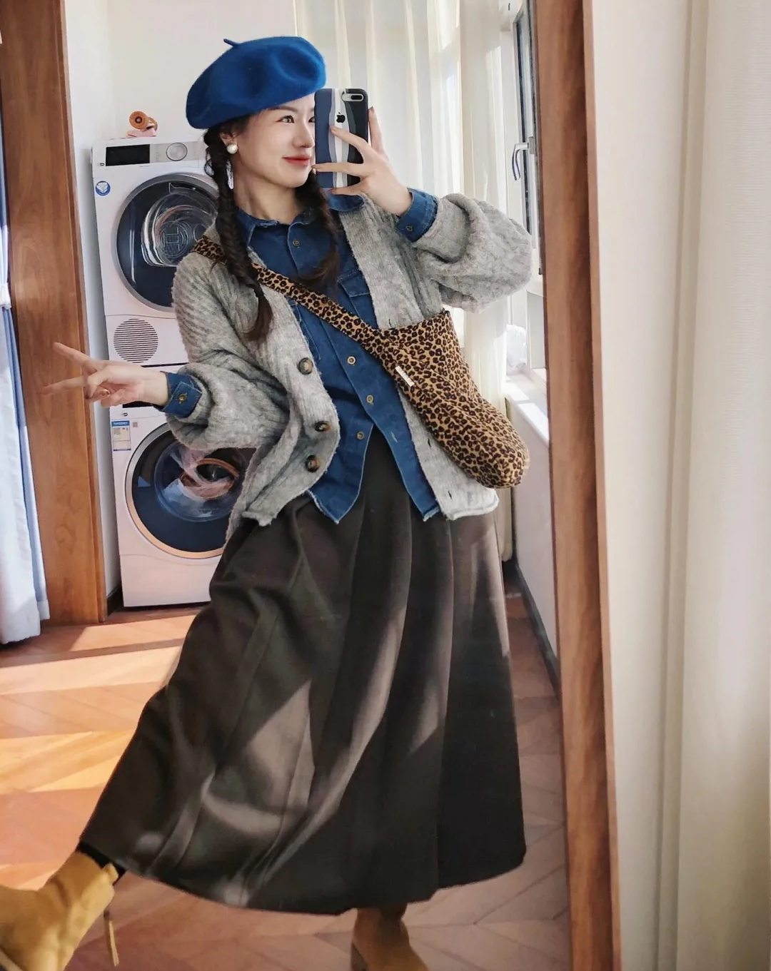 这组look也太让人心水了,蓝色衬衣配灰色开衫,下装搭配棕色的百褶半身裙,另外贝雷帽和衬衣颜色呼应,整个氛围感非常到位。