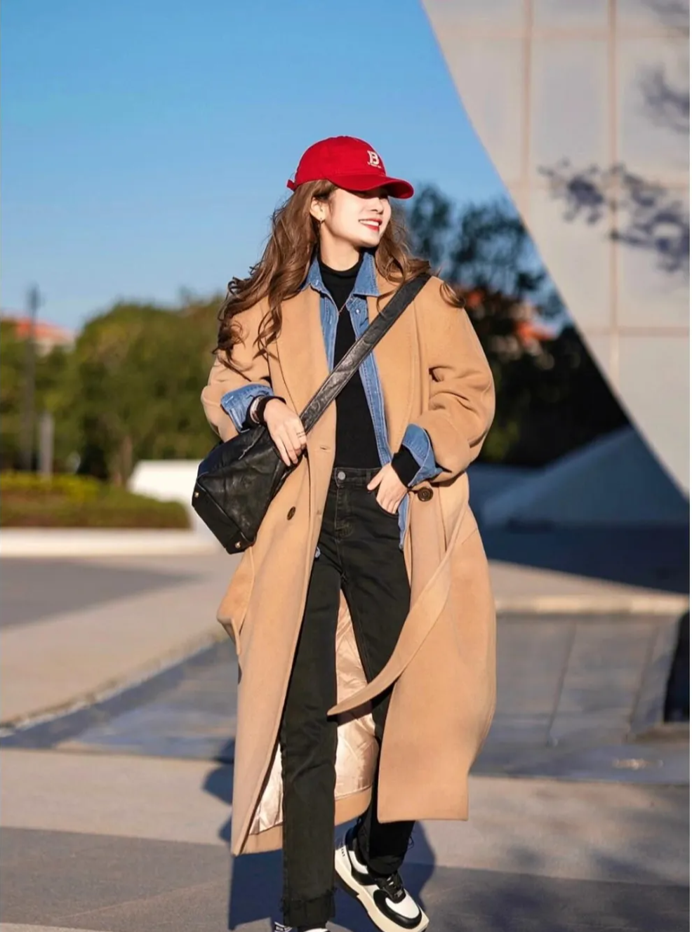 牛仔衬衣是叠穿王,冬天谁的衣橱里还少得了一件大衣呢,大衣配黑色打底有点乏味,但是我们通过我们通过利用蓝色的牛仔外套,一下子就有层次感了,搭配小黑裤,和红色棒球帽,耐看洋气。