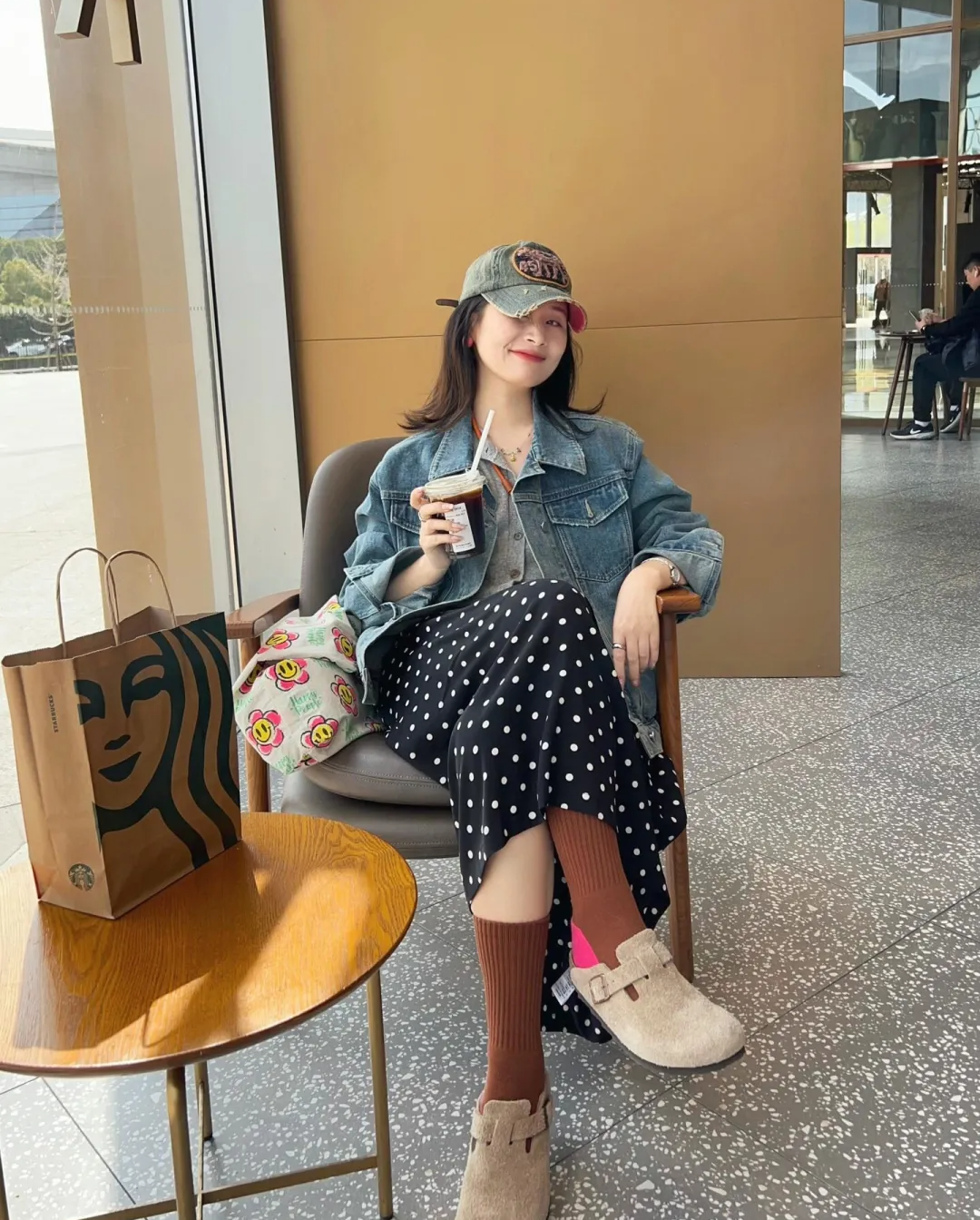 牛仔衬衣既可以当单穿又可以当外套穿,上衣搭配灰色毛衣,配波点半裙,这个搭配看起来既有点时髦的气质又很减龄,另外搭配波点鞋,非常舒适又实用的look。