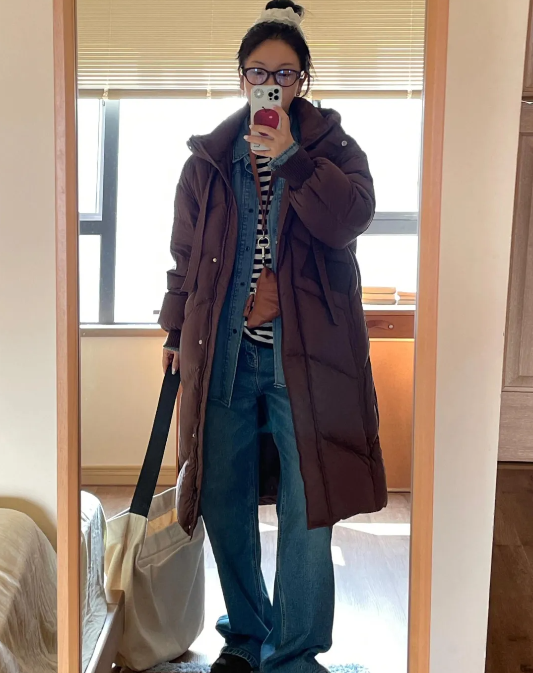 一身牛仔风格如何穿出不乏味的感觉,内搭条纹衫,这样即便外套搭配的是长款棕色羽绒服这样难搭的单品也不会土气。