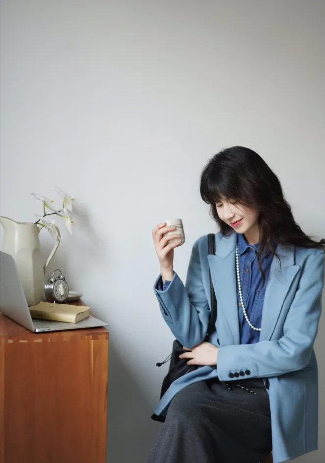 当牛仔衬衣遇上蓝色外套,视觉上一下子就觉得很清新养眼,想要稳重感一点的颜色,就去搭配灰色系的半身裙,这样搭既有格调又不失稳重,另外再搭配一条珍珠项链作为点缀,整个大方气质。