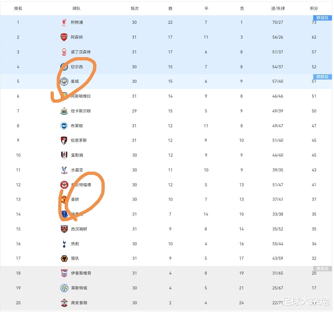 本赛季英超冠军没有悬念,阿森纳、森林占据二、三名,最后一个欧冠席位争夺非常激烈,包括布莱顿、纽卡、维拉、切尔西以及曼城!