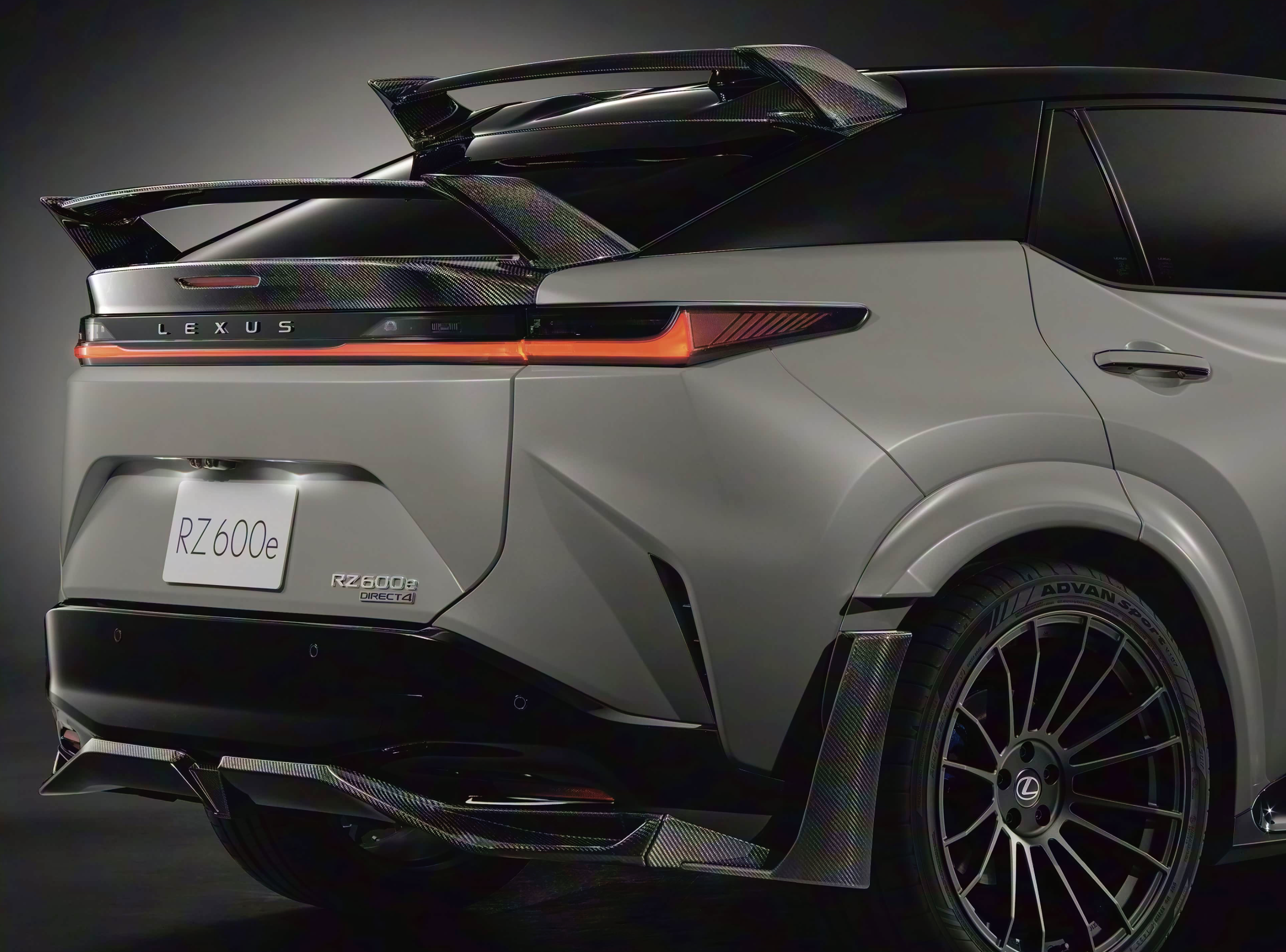 外观方面,雷克萨斯RZ 600e F Sport Performance的车头加入了黑色碳纤维材质,并带有大量挖孔处理的前舱盖,封闭式的黑色碳纤维格栅搭配着可发光的雷克萨斯车标,两侧前大灯造型十分犀利,黑色的大灯边框内部融入了雷克萨斯家族式的闪电状LED光带和下方三颗横置排列的独立LED光源组成的日行灯,远近光一体式光源和三角形的转向灯共同组成了该车的前大灯照明系统,科技感十足。纺锤形的封闭式格栅两侧配备了硕大的带有斜向纹路的碳纤维饰板,中间大尺寸进气口和横置式的中网,再配上纤薄的黑色碳纤维前铲,也极具侵略性。车尾配备了双后扰流板设计,贯穿式的尾灯加入了黑色灯罩,增添了更多的神秘气息,内部融入了红色贯穿式的灯带,极具辨识度。夸张的底部扩散器、碳纤维运动包围以及向上卷起的大尺寸裙边,带来了更强的视觉冲击力。