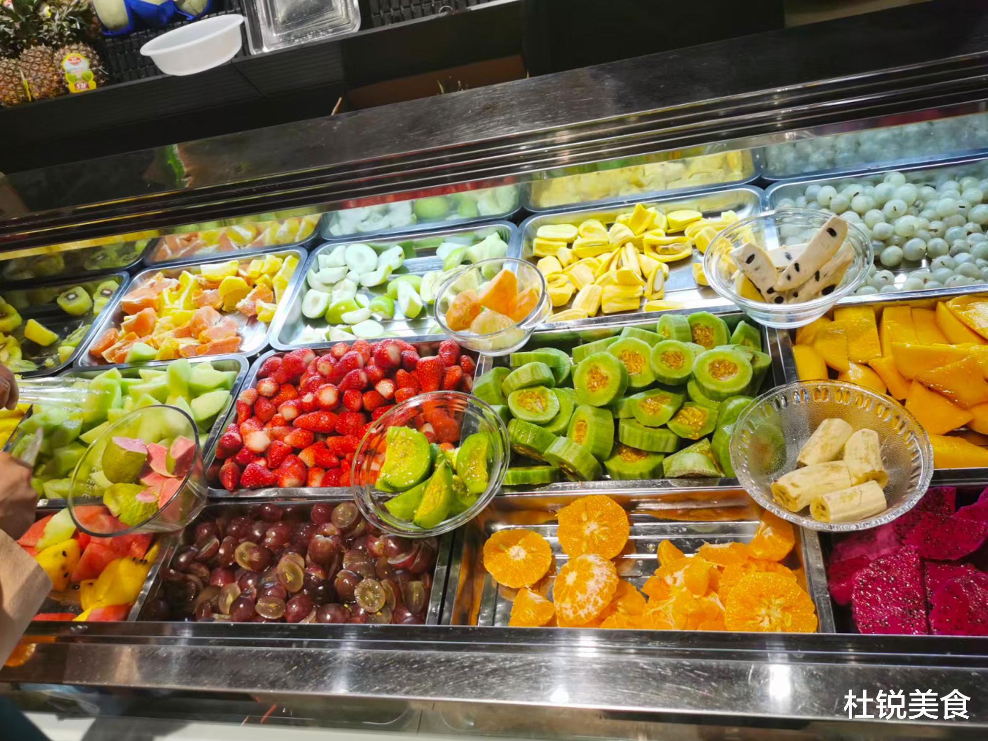 自助餐吃到阑珊处,收尾阶段很多人会挑选几款水果来调节一下口味,这也难怪有人说自助餐的尽头是水果。挑选水果,那些大盘盛装的西瓜、香蕉、哈密瓜、香瓜等就别去拿了,容易被氧化得乌七麻黑的苹果、香梨等,也尽量别吃。少来点榴莲、蓝莓、山竹等昂贵水果品种,绝不失一种明智之举。