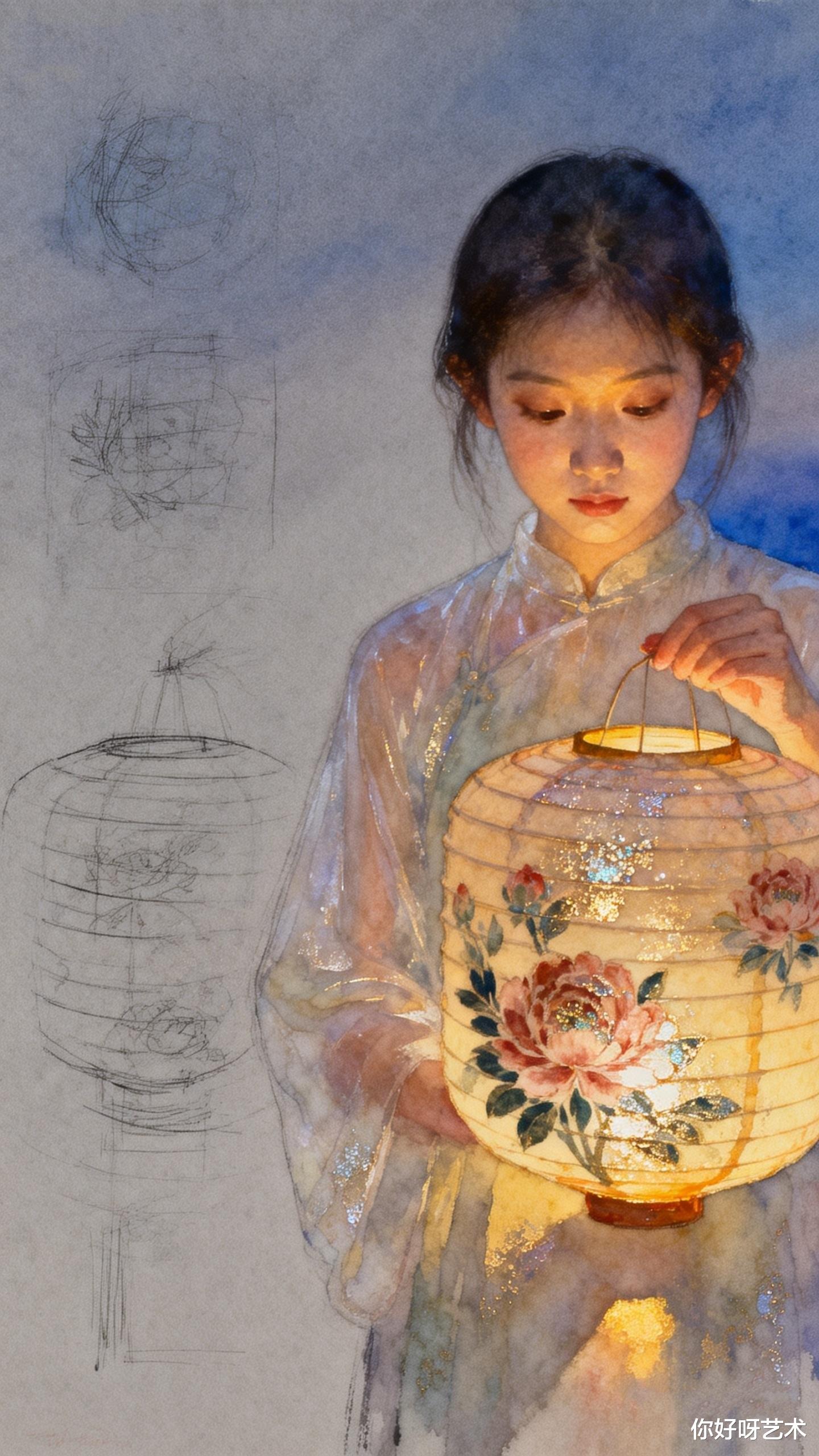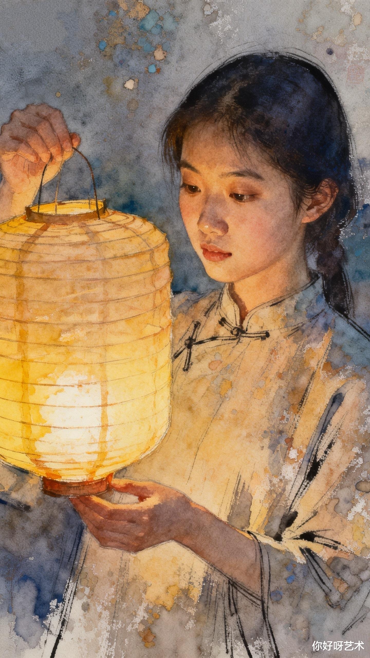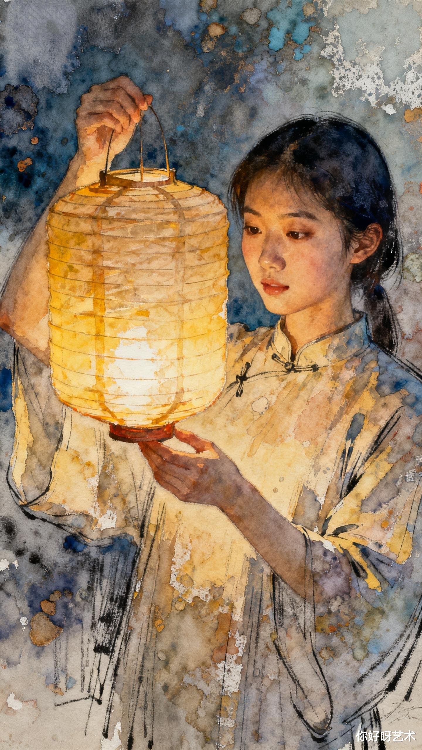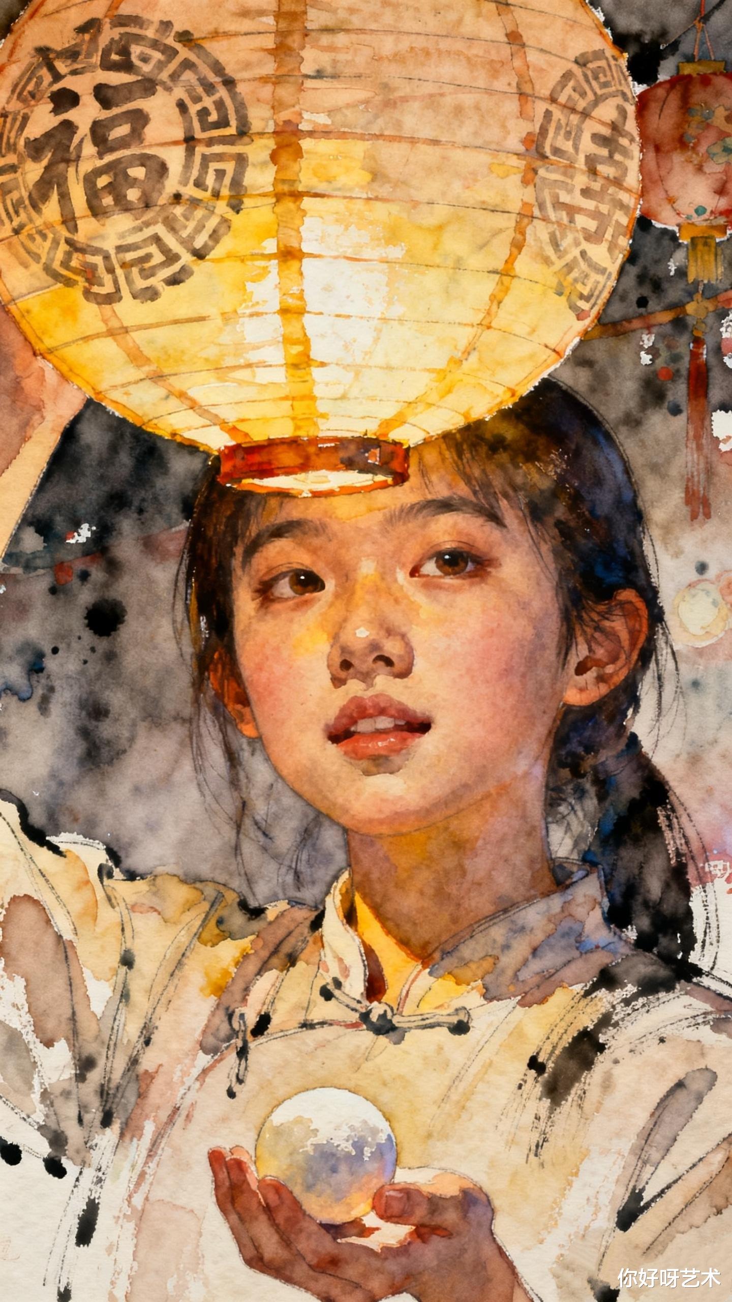 正月十四的晨光刚爬上窗棂,水彩少女便提着竹篮走向祠堂。篮里躺着新裁的彩纸,红如朱砂,黄似金箔,是昨夜母亲在灯下剪的。剪刀划过纸面时,能听见"沙沙"的轻响,像极了春风拂过麦浪。少女的围裙上还沾着昨夜画灯时的水彩,蓝与绿交织,像极了冬日里未融的晨雾。