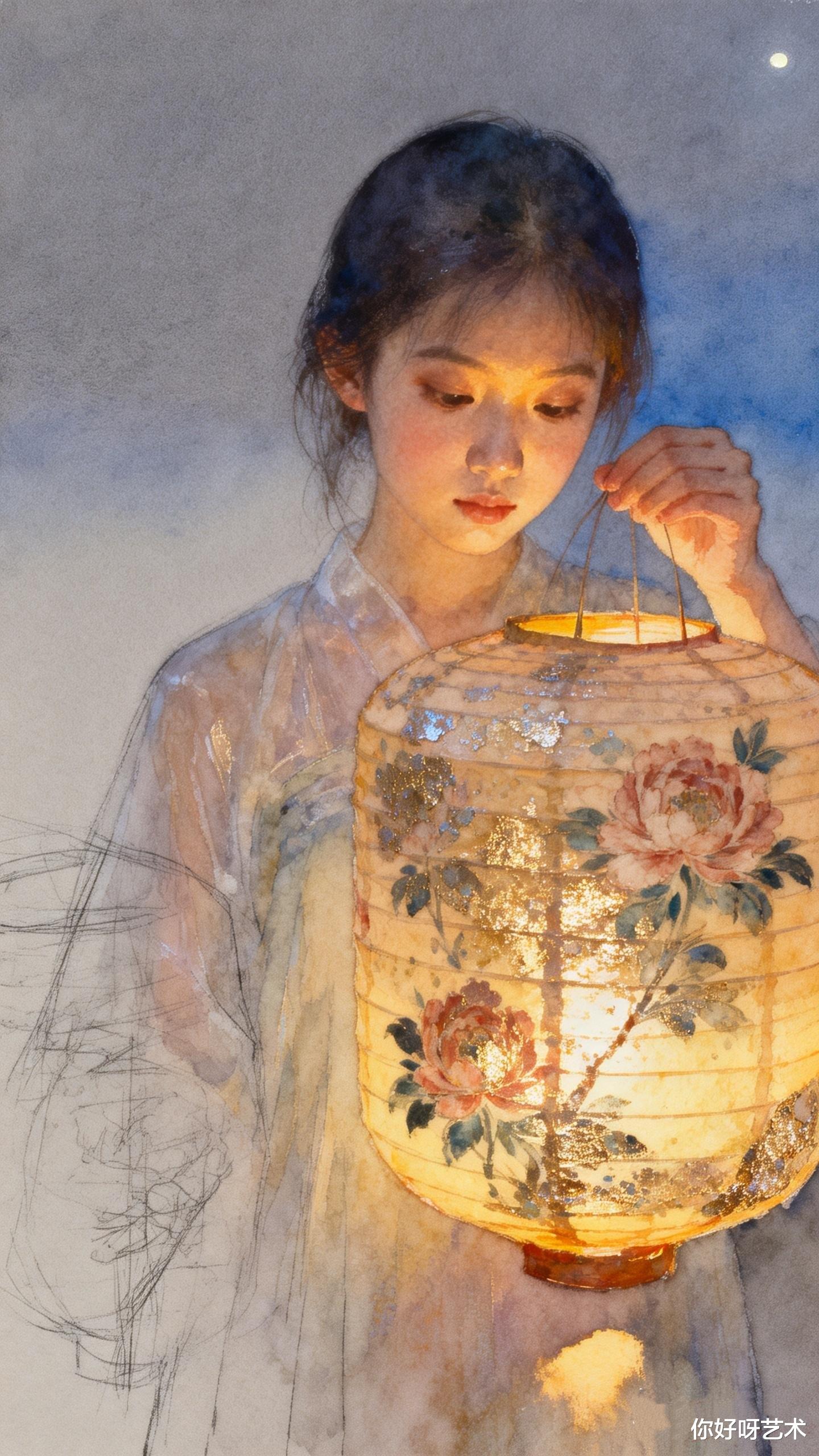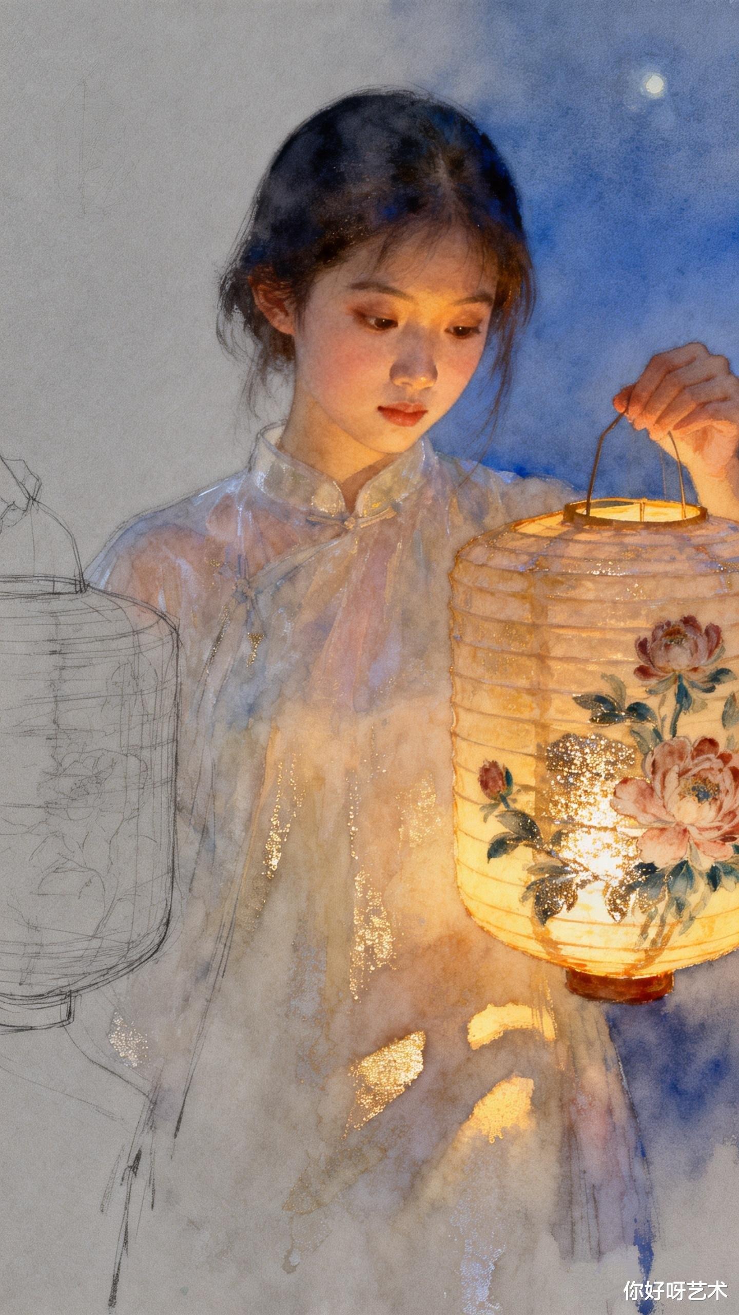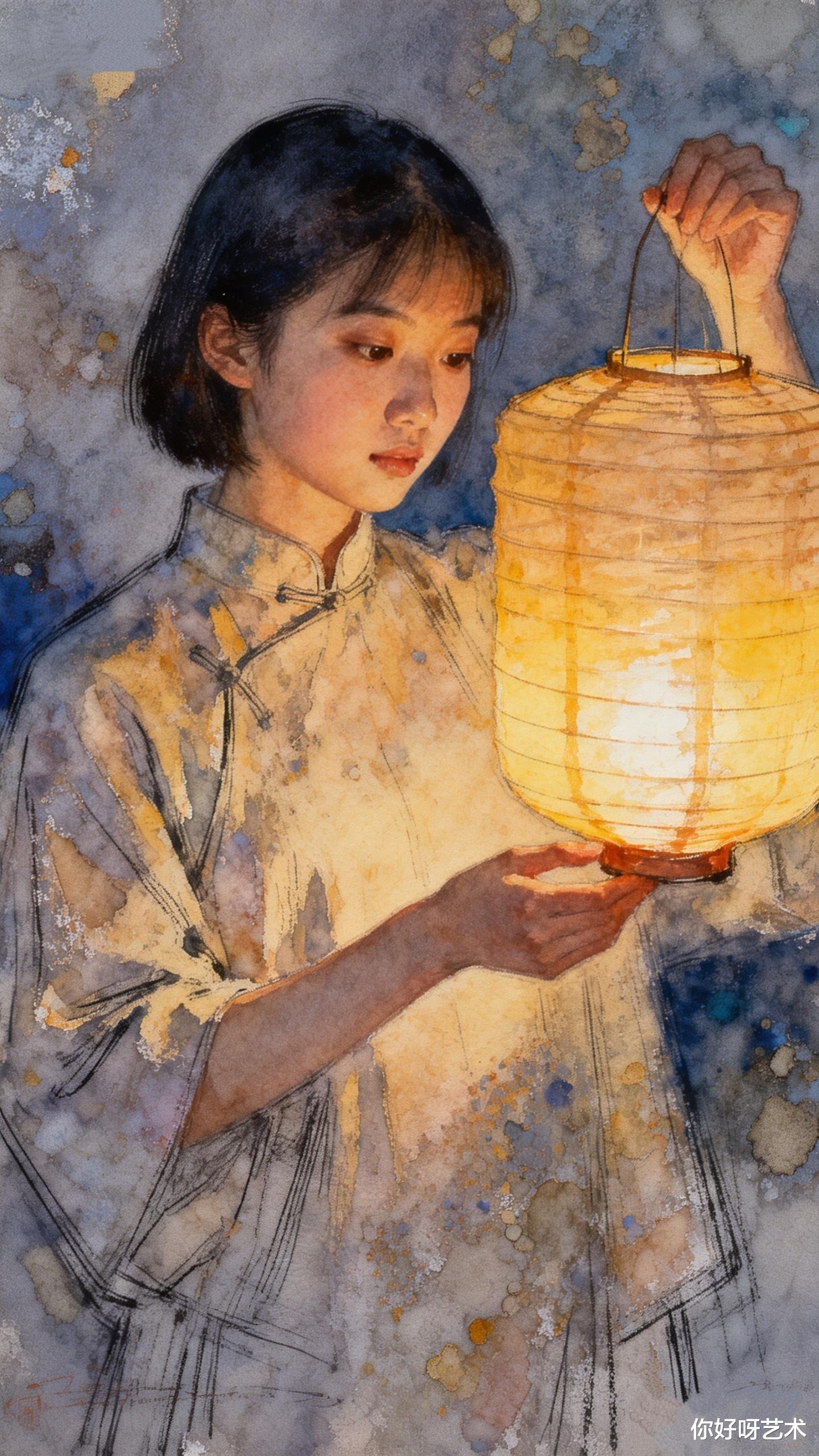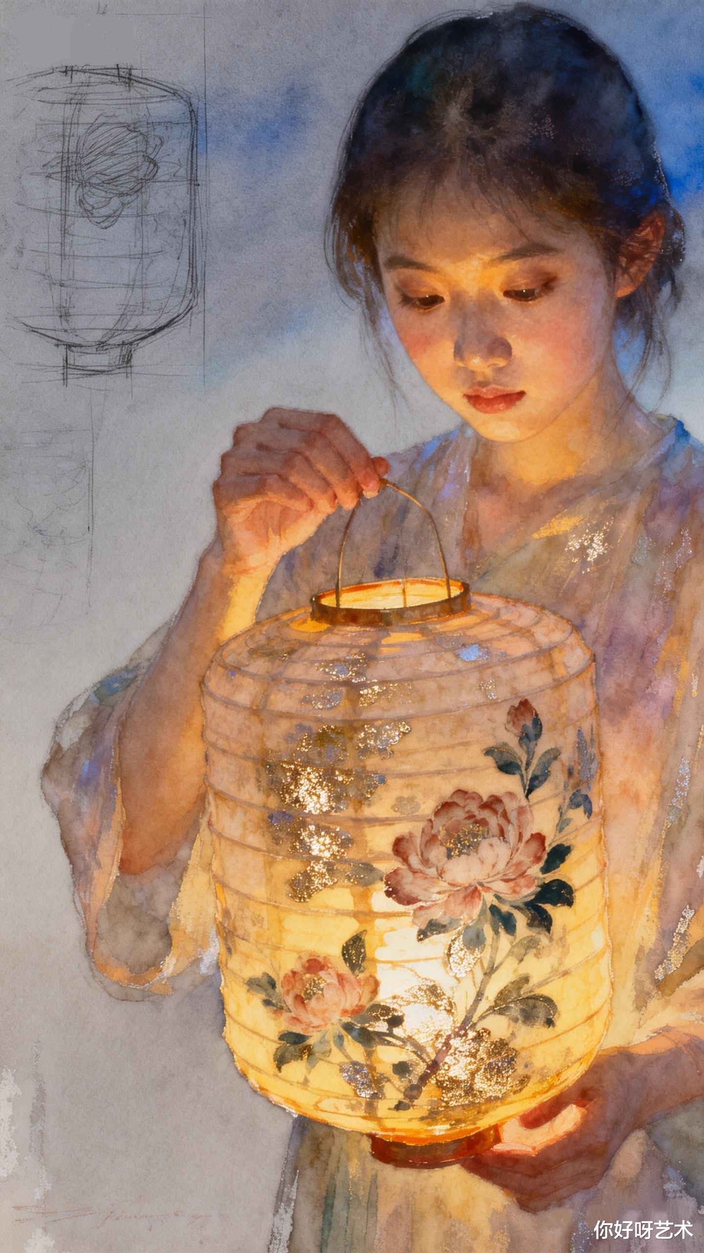 正月十四的晨光刚爬上窗棂,水彩少女便提着竹篮走向祠堂。篮里躺着新裁的彩纸,红如朱砂,黄似金箔,是昨夜母亲在灯下剪的。剪刀划过纸面时,能听见"沙沙"的轻响,像极了春风拂过麦浪。少女的围裙上还沾着昨夜画灯时的水彩,蓝与绿交织,像极了冬日里未融的晨雾。