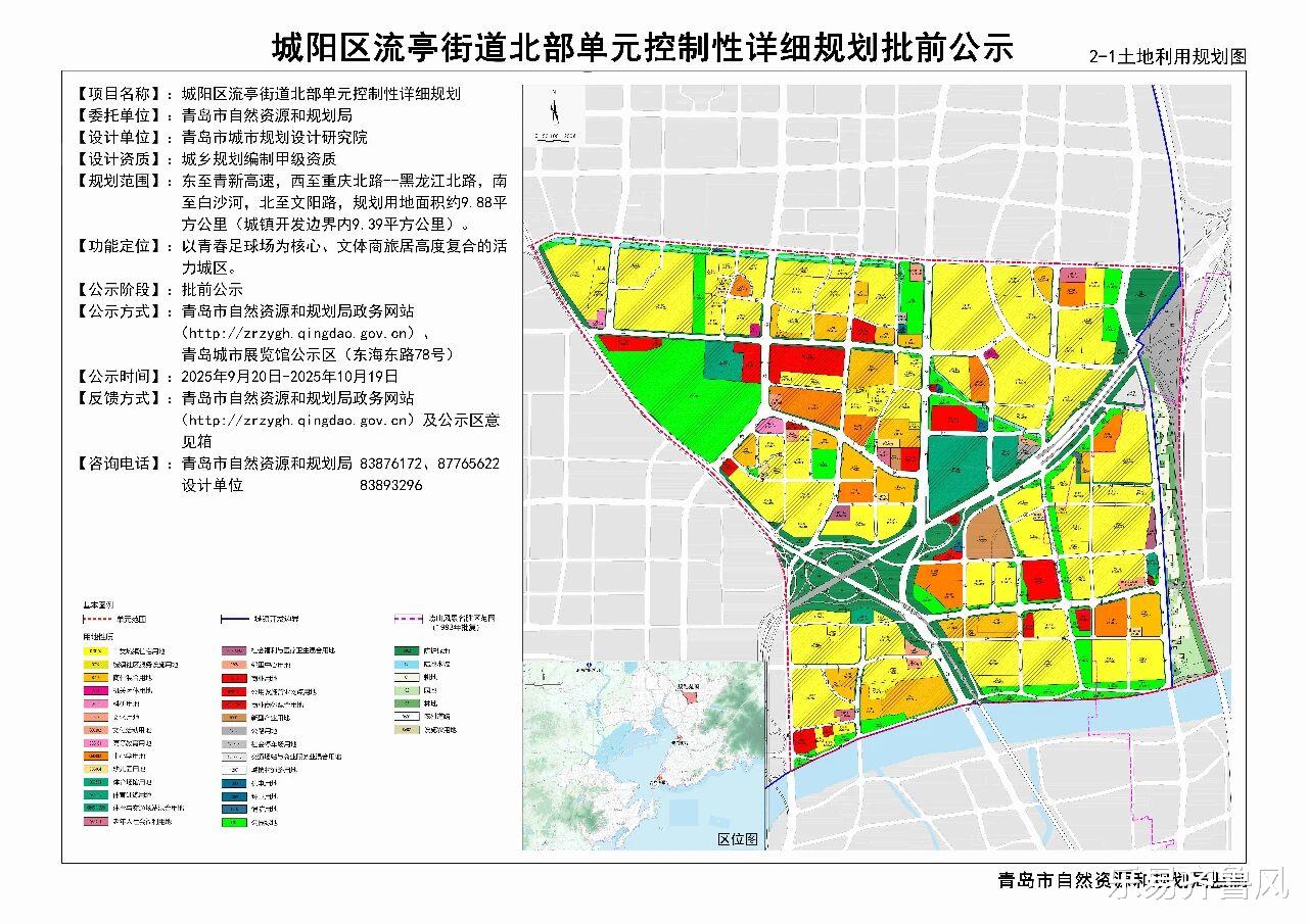 城阳区流亭街道北部单元东至青新高速,西至重庆北路-黑龙江北路,南至白沙河,北至文阳路,规划用地面积约9.88平方公里(城镇开发边界内9.39平方公里),定位为以青春足球场为核心、文体商旅居高度符合的活力城区。