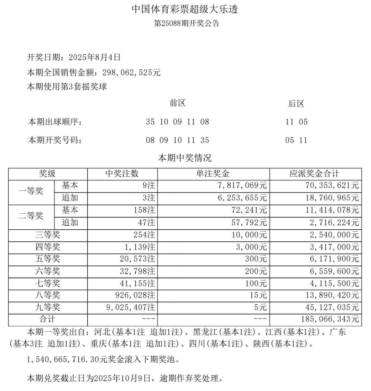 本期中奖详情:一等奖全国共开出了9注,单注奖金为7,817,069元;其中有3注都还采用了追加的投注方式,所以每注又多得6,253,655元的追加奖金;二等奖则是开出了158注,单注奖金为72,241元;其中有47注还采用了追加的投注方式,所以每注又多得了57,792元的追加奖金;本期一等奖分落:广东(基本3注,追加1注)、河北(基本1注,追加1注)、重庆(基本1注,追加1注)、黑龙江(基本1注)、江西(基本1注)、四川(基本1注)和陕西(基本1注),共9注。