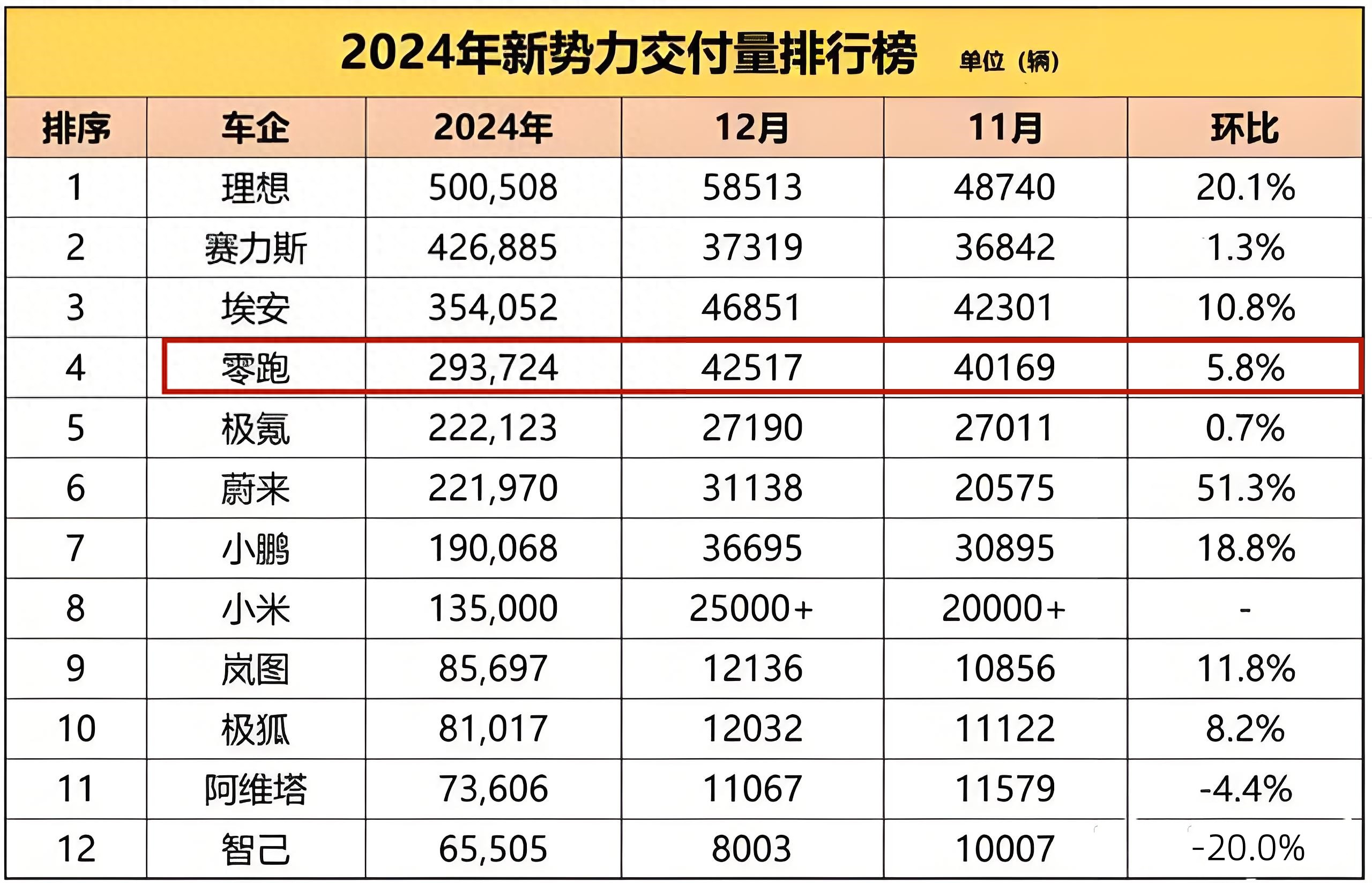 在新能源汽车市场日益激烈的竞争中,零跑汽车以其出色的表现和稳健的步伐,逐渐崭露头角。刚刚过去的2024年,对零跑汽车而言是极具里程碑意义的一年。全年销量达到了29.3万辆,不仅超额完成了年度小目标,还实现了月销量的七连跳,这一成绩无疑彰显了其在消费者心中的认可度和市场影响力的快速提升。