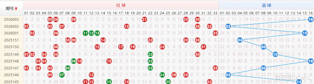 本期蓝球开出16,这是一个大号蓝球,上一次出现还是在25045期,间隔了整整58期。蓝球16的开出打破了近期蓝球小号的垄断格局,为彩友们提供了新的选号思路。