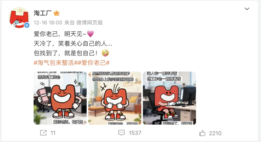 淘工厂则直接改编口号,用一句 “没人会一直陪我,但工资会 —— 爱你老己,明天见”,精准戳中打工人的心声,引发强烈共鸣。