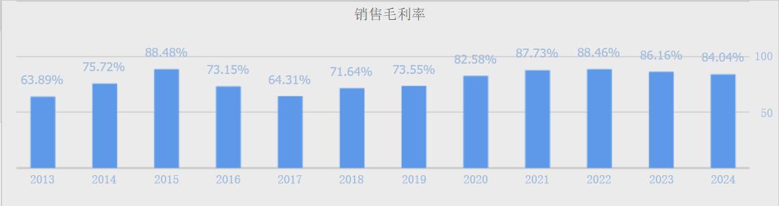 公司毛利率常年在80%以上,且保持稳定。