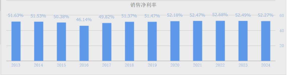 因此,公司净利率高于毛利率,常年净利率都在100%以上。20年至24年连续五年净利率和毛利率都大于50%。