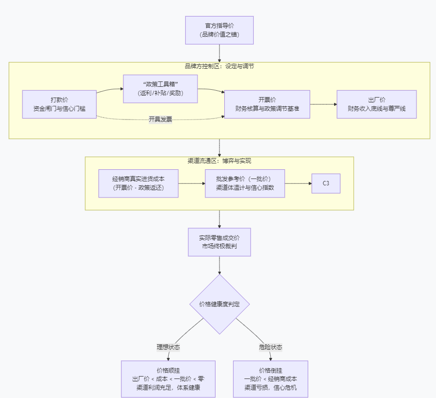 开票价是厂商开具发票的名义金额,通常介于出厂价与打款价之间。其关键在于,厂商后续会通过返利、补贴等政策,将打款价与开票价之间的差额返还经销商。这一设计成为精巧的“财务缓冲器”:既能在账面上维持出厂价的刚性,避免直接降价损伤品牌形象,又能通过调节返利,灵活操控经销商的真实进货成本,实现对渠道的隐秘调控。
