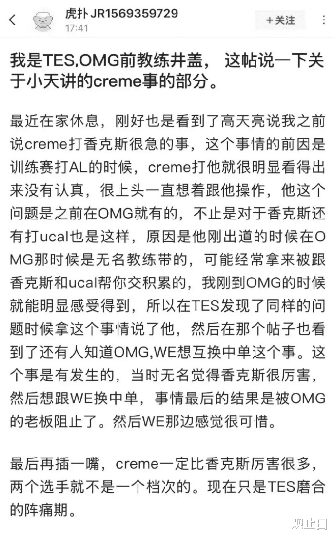 此前TES前教练井盖曾在虎扑发帖,称“Creme一定比Shanks厉害很多,两人不是一个档次” 。如今如果真加盟AL,这尴尬程度直接拉满——网友调侃:“以后队内开会,Shanks是不是得先翻个白眼?”