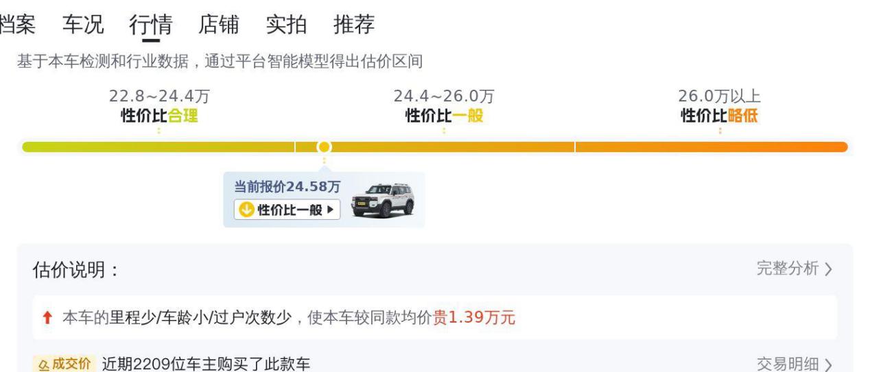 然后,我们再看看它的市场行情。根据二手车平台的数据,同款车型在24.07万到29.56万之间浮动,这辆车的价格24.58万,处于偏低价位。这说明什么呢?一方面,它的瑕疵确实影响了价格;另一方面,也说明现在二手普拉多的价格已经比较“亲民”了。