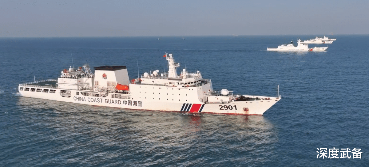 中国海军两横一纵的补给编队场景,从上世纪90年代前后就时常刊登在杂志上,成为了彩色插页当中的经典。而如今,这一画面竟然“复制”在了中国海警的编队中,令人更惊喜的是,在编队中央担当“补给舰”的竟然是万吨级海警2901舰,该舰可以称得上是海警中的055,四艘舰艇吨位合起来足有两万吨。