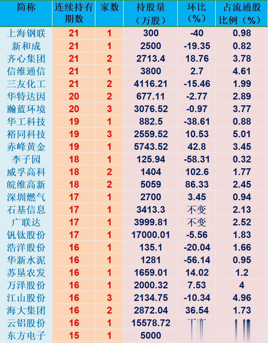 24. 中旗股份:连续持有22期,合计228.85万股,占流通比例0.67%;