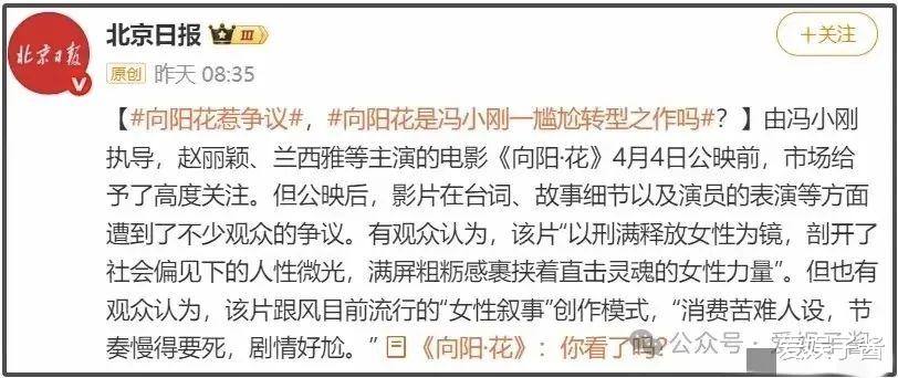 《向阳·花》的争议不仅在于角色,更在于导演冯小刚。影片主打“全女性阵容+底层逆袭”,却因对女性角色的刻板刻画(如“特殊行业妈妈”的猎奇视角)遭炮轰。媒体直言这是“冯小刚的尴尬转型”,连带赵丽颖也被贴上“选片眼光差”的标签。