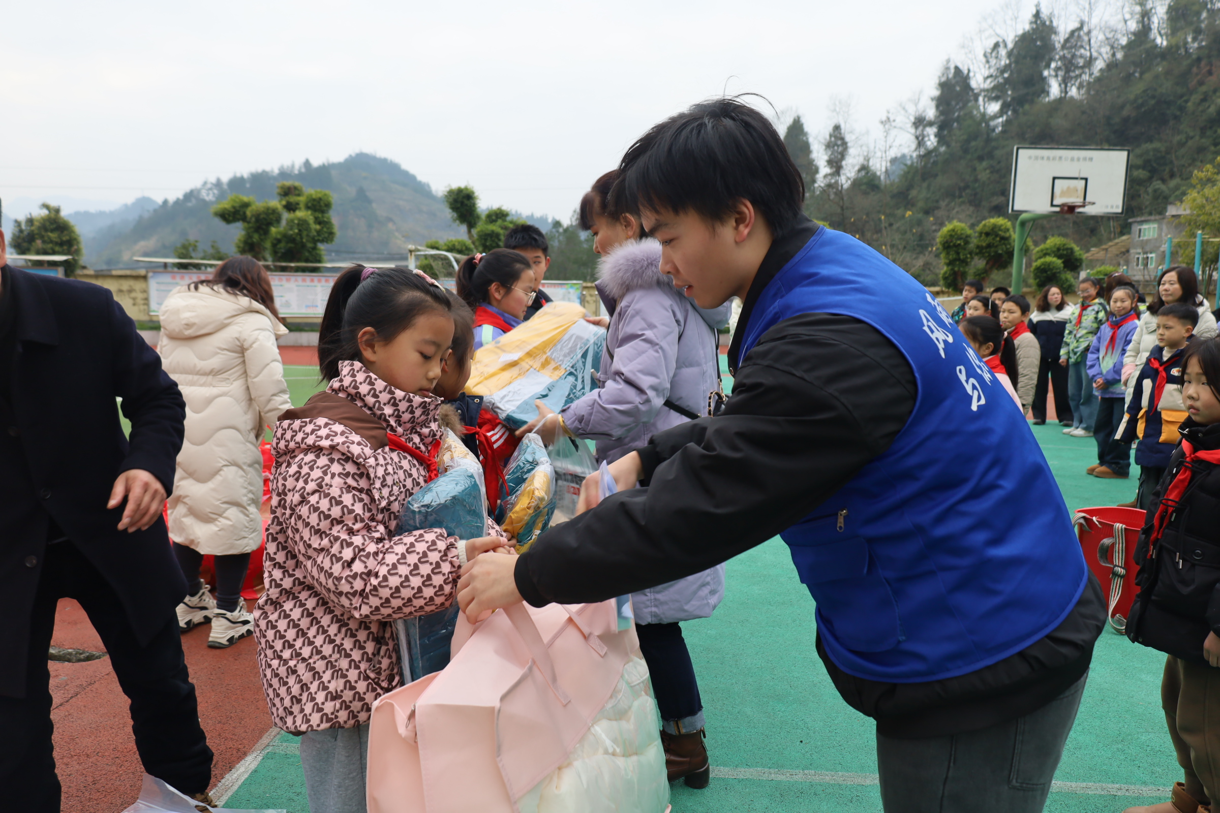 翻山越岭送暖意,爱心礼包映童心。1月22日清晨,冉开鑫跟随彭水县同欣社会工作服务中心的社工,先后前往张家坝小学与羊头铺小学,两所学校共有学生150余人。活动现场,冉开鑫与社工、学校老师一同将包含三件套、衣物、被褥、书包、彩色笔等10样物资的爱心礼包逐一发放到孩子们手中,并为学生们讲解彩色笔的使用方法。一位二年级女孩接过新书包时小声说道“谢谢哥哥”,稚嫩的童声让这个寒冬格外温暖。当天累计行车60余公里,150余份爱心礼包全部精准送达。